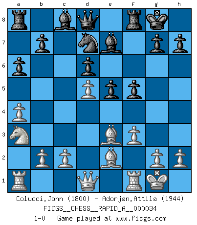 Last move : 1-0 2008 February 4 9:36:39 [Event "FICGS__CHESS__RAPID_A__000034"] [Site "FICGS"] [Date "2007.12.21"] [Round "1"] [White "Colucci,John"] [Black "Adorjan,Attila"] [Result "1-0"] [WhiteElo "1800"] [BlackElo "1944"] 1.e4 c5 2.Nf3 Nc6 3.d4 cxd4 4.Nxd4 Nf6 5.Nc3 e5 6.Ndb5 d6 7.Nd5 Nxd5 8.exd5 Nb8 9.a4 Be7 10.Be2 O-O 11.O-O a6 12.Na3 Nd7 13.Be3 f5 14.f3 1-0 Sicilian : Pelikan (Lasker/Sveshnikov) variation Kingside Castling by player Black (move 10) Kingside Castling by player White (move 11) Player White won this chess game. Follow this game move after move (download)Botvinnik tried to take the mystery out of Chess, always relating it to situations in ordinary life. He used to call Chess a typical inexact problem similar to those which people are always having to solve in everyday life. (Garry Kasparov) Ich könnte leicht behaupten: Ja,ja, Leonid Breschnew wollte nicht, daß ich Weltmeister werde. In der Tat war die Sache komplizierter. (Viktor Kortschnoi) Debemos de asegurarnos de que el Ajedrez no se convierta en un lenguaje muerto, muy interesante, pero tan solo para un grupo muy pequeño. (Sytze Faber) La vie et les Echecs sont tous les deux une lutte constante. (Lasker) The Internet isn't free. It just has an economy that makes no sense to capitalism. (Brad Shapcott)