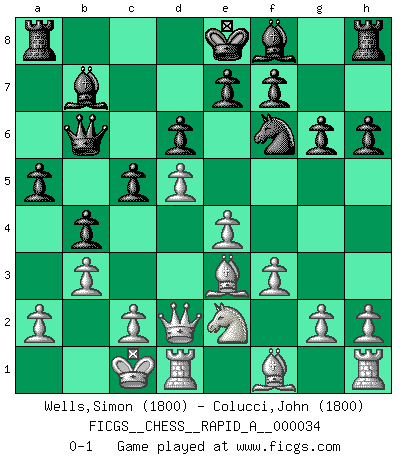 Last move : 0-1 2008 February 8 12:51:40 [Event "FICGS__CHESS__RAPID_A__000034"] [Site "FICGS"] [Date "2007.12.21"] [Round "1"] [White "Wells,Simon"] [Black "Colucci,John"] [Result "0-1"] [WhiteElo "1800"] [BlackElo "1800"] 1.d4 d6 2.e4 Nf6 3.Nc3 g6 4.Bg5 h6 5.Be3 a6 6.f3 Nbd7 7.Qd2 b5 8.O-O-O Bb7 9.Nge2 b4 10.Na4 a5 11.d5 c5 12.b3 Nb6 13.Nxb6 Qxb6 0-1 This chess game has been lost on time (started : 2007.12.21 15:46:10) Queen's Pawn Queenside Castling by player White (move 8) Player Black won this chess game. Follow this game move after move (download)Chess is everything: art, science and sport. (Anatoly Karpov) Wenn ich Weiß habe gewinne ich weil ich Weiß habe, wenn ich Schwarz habe gewinne ich weil ich Bogoljubov bin. (Efim Bogoljubov) Si el ingenio solamente fuese necesario para lucirse, las mujeres serían las mejores jugadoras de Ajedrez del mundo. (Albin) Les échecs, c'est l'imagination. (David Bronstein) Memory is a complicated thing, a relative to truth, but not its twin. (Barbara Kingsolver, Animal Dreams)