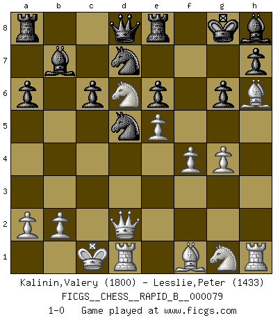 Last move : 1-0 2008 January 21 1:6:24 [Event "FICGS__CHESS__RAPID_B__000079"] [Site "FICGS"] [Date "2007.12.22"] [Round "1"] [White "Kalinin,Valery"] [Black "Lesslie,Peter"] [Result "1-0"] [WhiteElo "1800"] [BlackElo "1433"] 1.d4 Nf6 2.c4 g6 3.Nc3 Bg7 4.e4 O-O 5.f3 d6 6.Be3 c6 7.Qd2 Re8 8.O-O-O a6 9.h4 b5 10.g4 bxc4 11.Bh6 Bh8 12.h5 Nbd7 13.hxg6 fxg6 14.Bxc4+ e6 15.e5 dxe5 16.dxe5 Nd5 17.f4 N7b6 18.Bf1 Bb7 19.Ne4 Nd7 20.Nd6 1-0 King's Indian : 4.e4 Kingside Castling by player Black (move 4) Queenside Castling by player White (move 8) Player White won this chess game. Follow this game move after move (download)I like to say that Bobby Fischer was the greatest player ever. But what made Fischer a genius was his ability to blend an American freshness and pragmatism with Russian ideas about strategy. (Bruce Pandolfini) Das typische an einem Großmeister ist, daß er eine gewonnene Position schnell und schmerzlos gewinnt. (Irving Chernev) Coloca el contenido de las piezas del Ajedrez en un sombrero, agitalo vigorosamente, arrojalas en un tablero desde una altura de 30 centimetros y así obtendras el estilo de Steinitz. (H. E. Bird) Que feriez-vous si vous étiez en train de jouer aux échecs et que la fin du monde arrive ? Je continuerais à jouer. (Saint Borromée) Always remember that you are unique; just like everyone else. (Unknown)