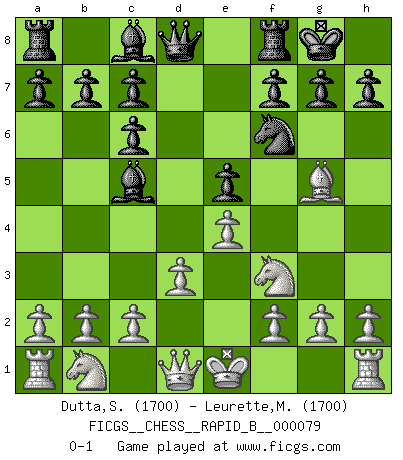 Last move : 0-1 2008 January 30 12:18:11 [Event "FICGS__CHESS__RAPID_B__000079"] [Site "FICGS"] [Date "2007.12.22"] [Round "1"] [White "Dutta,Shivam"] [Black "Leurette,Marc-Antoine"] [Result "0-1"] [WhiteElo "1700"] [BlackElo "1700"] 1.e4 e5 2.Nf3 Nc6 3.Bb5 Nf6 4.d3 Bc5 5.Bg5 O-O 6.Bxc6 dxc6 0-1 This chess game has been lost on time (started : 2007.12.22 5:36:35) Ruy Lopez : Berlin defense Kingside Castling by player Black (move 5) Player Black won this chess game. Follow this game move after move (download)A chess genius has died; a loss for humanity. (Viktor Kortchnoi, about Bobby Fischer's death) Ich moechte nie einem Club beitreten, der Leute wie mich als Mitglieder aufnimmt. (Woody Allen) Preferería tener un Peón que un dedo. (Reuben Fine) Pour se monter efficace, un Cavalier a besoin d'avant-postes ! Les Cavaliers font les meilleurs bloqueurs de pions passés. The real voyage of discovery consists not in seeking new lands but in seeing with new eyes. (Marcel Proust)