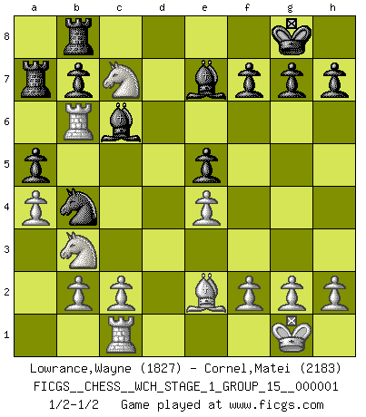 Last move : 1/2-1/2 2006 September 13 1:23:32 [Event "FICGS__CHESS__WCH_STAGE_1_GROUP_15__000001"] [Site "FICGS"] [Date "2006.07.01"] [Round "1"] [White "Lowrance,Wayne"] [Black "Cornel,Matei"] [Result "1/2-1/2"] [WhiteElo "1827"] [BlackElo "2183"] 1.e4 c5 2.Nf3 d6 3.d4 cxd4 4.Nxd4 Nf6 5.Nc3 a6 6.Be2 e5 7.Nb3 Be7 8.O-O O-O 9.Be3 Be6 10.Qd2 a5 11.a4 Nc6 12.Rfd1 Nb4 13.Bf3 Qc7 14.Rac1 Qc4 15.Be2 Qc6 16.Bg5 Rfc8 17.Bb5 Qb6 18.Bxf6 Bxf6 19.Qxd6 Qxd6 20.Rxd6 Be7 21.Rb6 Rcb8 22.Be2 Bd7 23.Nb5 Bc6 24.Nc7 Ra7 25.Nb5 R7a8 26.Nc7 Ra7 1/2-1/2 Sicilian : Najdorf, Opovcensky variation Kingside Castling by player White (move 8) Kingside Castling by player Black (move 8) This chess game ended in a draw. Follow this game move after move (download)The winner of the game is the player who makes the next-to-last mistake. (Savielly Tartakover) Ich las kürzlich ein Buch von Nietzsche. Er sagte Religion verdumme nur die Menschen. Ich stimme zu. (Robert James Fischer) Un mal plan es mejor que no tener ningún plan. (Frank Marshall) On n'a jamais que l'âge auquel on a commence à jouer aux échecs car après on cesse de vieillir. (Capablanca) May the force be with you. (Han Solo in Star Wars ep.4)