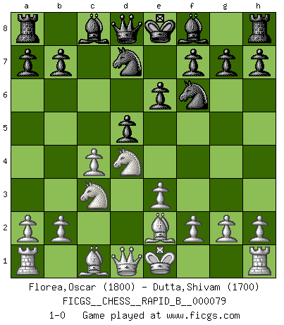 Last move : 1-0 2008 January 29 12:11:1 [Event "FICGS__CHESS__RAPID_B__000079"] [Site "FICGS"] [Date "2007.12.22"] [Round "1"] [White "Florea,Oscar"] [Black "Dutta,Shivam"] [Result "1-0"] [WhiteElo "1800"] [BlackElo "1700"] 1.d4 Nf6 2.c4 e6 3.Nf3 d5 4.e3 c5 5.Nc3 Nbd7 6.Be2 cxd4 7.Nxd4 1-0 This chess game has been lost on time (started : 2007.12.22 5:36:35) Queen's pawn game Player White won this chess game. Follow this game move after move (download)The winner of the game is the player who makes the next-to-last mistake. (Savielly Tartakover) Der Bart als Geschlechtszeichen mitten im Gesicht ist obszön. Daher gefällt er den Weibern. [Zugegeben, kein Schachzitat, aber unglaublich originell] (Arthur Schopenhauer) El juego de Damas es para vagabundos. (Paul Morphy) Lorsque vous vous retrouvez devant une position atroce, ne tendez pas un ultime piège dérisoire avec l'intention d'abandonner si l'adversaire le déjoue ! Faites-vous plutôt un devoir de résister comme si votre vie en dépendait. Jouez le coup qui vous déplairait au centuple si vous étiez dans la peau de votre tortionnaire ! Go and wake up your luck. (Persian saying)