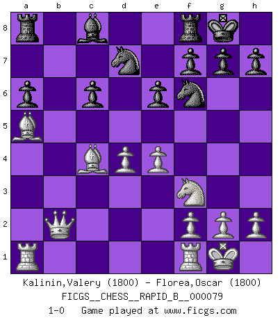 Last move : 1-0 2008 January 1 22:51:30 [Event "FICGS__CHESS__RAPID_B__000079"] [Site "FICGS"] [Date "2007.12.22"] [Round "1"] [White "Kalinin,Valery"] [Black "Florea,Oscar"] [Result "1-0"] [WhiteElo "1800"] [BlackElo "1800"] 1.d4 d5 2.c4 c6 3.Nc3 Nf6 4.Nf3 dxc4 5.a4 e6 6.Bg5 Nbd7 7.e4 Qa5 8.Bd2 Bb4 9.Bxc4 O-O 10.O-O Bxc3 11.Bxc3 Qc7 12.Qe2 a6 13.a5 b5 14.axb6 Qxb6 15.Ba5 Qxb2 16.Qxb2 1-0 QGD Slav defense Kingside Castling by player Black (move 9) Kingside Castling by player White (move 10) Player White won this chess game. Follow this game move after move (download)The game of Chess is not merely an idle amusement; several very valuable qualities of the mind are to be acquired and strengthened by it, so as to become habits ready on all occasions; for life is a kind of Chess. (Benjamin Franklin) Jeder Schachmeister war einmal ein Anfänger. (Irving Chernev) Entre mas años cumplo, mas valoro los Peones. (Keres) Un footballeur joue avec ses pieds, parfois avec sa tête. Un joueur d'échecs ne joue qu'avec sa tête. Et quand il ne joue plus, il meurt. (Jacob Murray) Faith : not wanting to know what is true. (Friedrich Nietzsche)