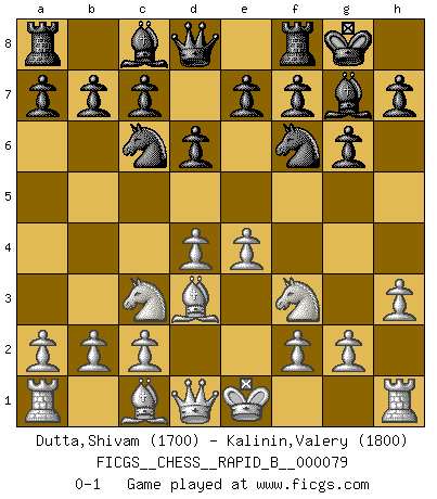 Last move : 0-1 2008 January 30 12:18:11 [Event "FICGS__CHESS__RAPID_B__000079"] [Site "FICGS"] [Date "2007.12.22"] [Round "1"] [White "Dutta,Shivam"] [Black "Kalinin,Valery"] [Result "0-1"] [WhiteElo "1700"] [BlackElo "1800"] 1.e4 d6 2.d4 Nf6 3.Nc3 g6 4.Nf3 Bg7 5.h3 O-O 6.Bd3 Nc6 0-1 This chess game has been lost on time (started : 2007.12.22 5:36:35) Pirc : Classical, h3 system Kingside Castling by player Black (move 5) Player Black won this chess game. Follow this game move after move (download)Every Pawn is a potential Queen. (James Mason) Schach wird sich dank seiner hohen kulturellen Tradition immer durchsetzen. In näherer Zukunft womöglich sogar als Gegenreaktion auf die maßlose Reizüberflutung im Freizeit- und Spielbereich. (Garry Kasparov) El Ajedrez se juega con la mente... ¡no con las manos!. (Renaud y Kahn) Je fais ceci parce que dans cinquante coups j'obtiendrai cela; je m'appelle Mikhail Moisevitch Botvinnik. (Botvinnik) Whatever you do, don't be bored. This is absolutely the most exciting time we could have possibly hoped to be alive. And things are just starting. (From movie Waking life)