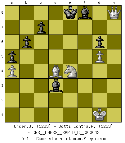 Last move : 0-1 2008 April 20 8:8:36 [Event "FICGS__CHESS__RAPID_C__000042"] [Site "FICGS"] [Date "2007.12.24"] [Round "1"] [White "Orden,Jorge"] [Black "Dotti Contra,Alessandro"] [Result "0-1"] [WhiteElo "1283"] [BlackElo "1253"] 1.e4 e5 2.Nf3 Nc6 3.Bc4 f6 4.Bxg8 Rxg8 5.O-O d6 6.d3 Bg4 7.h3 Bh5 8.a3 Qd7 9.b4 O-O-O 10.Be3 d5 11.c3 Be7 12.b5 dxe4 13.bxc6 Qxc6 14.g4 Bg6 15.Nfd2 exd3 16.Nf3 e4 17.Nd4 Qd5 18.Nd2 h5 19.a4 a5 20.gxh5 Bh7 21.c4 Qc5 22.Ne6 Qf5 23.Nxd8 Kxd8 24.Qg4 Qxg4+ 25.hxg4 f5 26.g5 g6 27.h6 b6 28.f3 Rf8 29.fxe4 fxe4 30.Rxf8+ Bxf8 31.Nxe4 Be7 32.Rd1 Ke8 33.Rxd3 Bg8 34.Bd4 Bxc4 35.h7 Bxd3 36.h8Q+ Bf8 0-1 This chess game has been lost on time (started : 2007.12.24 20:14:17) King's pawn game Kingside Castling by player White (move 5) Queenside Castling by player Black (move 9) Promotion Queen by player White (move 36) Player Black won this chess game. Follow this game move after move (download)I like the moment when I break a man's ego. (Bobby Fischer) Im Internet Chess Club betrug mein Rating vorübergehend 3350 ELO-Punkte. (Sergej Karjakin) Alguna parte de un error es siempre correcto. (Savielly Tartakover) La vie est comme un jeu d'échecs : nous esquissons un plan, mais celui-ci est tributaire de ce que daignent faire l'adversaire aux échecs et le destin dans la vie. (Arthur Schopenhauer) Being number two sucks. (Andre Agassi)