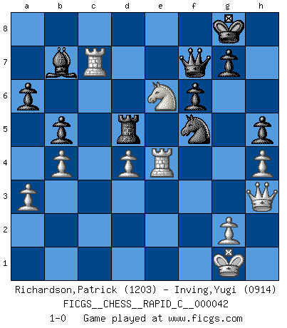 Last move : 1-0 2008 February 26 0:3:0 [Event "FICGS__CHESS__RAPID_C__000042"] [Site "FICGS"] [Date "2007.12.24"] [Round "1"] [White "Richardson,Patrick"] [Black "Inving,Yugi"] [Result "1-0"] [WhiteElo "1203"] [BlackElo "0914"] 1.d4 d5 2.c4 Nc6 3.Nf3 Nf6 4.Nc3 e6 5.Bg5 Be7 6.e3 O-O 7.Bd3 dxc4 8.Bxc4 h6 9.Bh4 b6 10.O-O Bb7 11.Rc1 a6 12.a3 Qd7 13.h3 Rfd8 14.Qc2 Qe8 15.b4 Nd5 16.Nxd5 exd5 17.Bd3 Bxh4 18.Nxh4 Rd6 19.Nf5 Re6 20.Qd1 Rd8 21.Qg4 Rg6 22.Qf4 Rd7 23.Rc3 Qd8 24.Rfc1 b5 25.Ng3 Rf6 26.Qg4 Rfd6 27.h4 Ne7 28.f4 c6 29.f5 f6 30.Nh5 Nc8 31.Nf4 Qe8 32.Ne6 Nb6 33.Qg3 Qf7 34.Re1 Bc8 35.e4 dxe4 36.Rxe4 Nd5 37.Rc1 h5 38.Bc2 Ne7 39.Bb3 Nxf5 40.Qh3 Rd5 41.Rxc6 Bb7 42.Bxd5 Rxd5 43.Rc7 1-0 QGD : Chigorin defense Kingside Castling by player Black (move 6) Kingside Castling by player White (move 10) Player White won this chess game. Follow this game move after move (download)The passion for playing Chess is one of the most unaccountable in the world. (H.G. Wells) Ja, jede Frau in Holland liebt mich bestimmt, und alle Männer hassen mich. (Loek van Wely) Bobby Fischer es el jugador de Ajedrez mas grande que jamás haya existido. (Ken Smith) On peut tirer plus d'utilité d'une partie perdue que de 100 parties gagnées. (Capablanca) Man is still the most extraordinary computer of all. (John F. Kennedy)