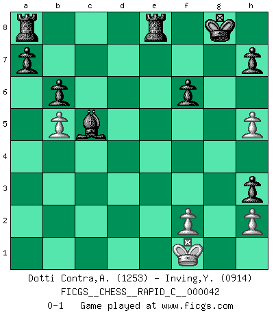 Last move : 0-1 2008 February 8 22:52:43 [Event "FICGS__CHESS__RAPID_C__000042"] [Site "FICGS"] [Date "2007.12.24"] [Round "1"] [White "Dotti Contra,Alessandro"] [Black "Inving,Yugi"] [Result "0-1"] [WhiteElo "1253"] [BlackElo "0914"] 1.e4 c5 2.Nf3 Nc6 3.d4 cxd4 4.Bd3 Nf6 5.O-O e5 6.Bg5 Be7 7.Bh4 O-O 8.c3 d5 9.cxd4 dxe4 10.Nxe5 exd3 11.Qxd3 Nxe5 12.Qg3 Qxd4 13.Na3 Nh5 14.Rad1 Qxb2 15.Qe3 Bxa3 16.Rd2 Nc4 17.Rxb2 Nxe3 18.Rb3 Nxf1 19.Kxf1 Bc5 20.Rb5 b6 21.a4 Ba6 22.g3 f6 23.g4 g5 24.gxh5 gxh4 25.Kg1 Bxb5 26.axb5 h3 27.Kf1 Rfe8 0-1 Sicilian defense Kingside Castling by player White (move 5) Kingside Castling by player Black (move 7) Player Black won this chess game. Follow this game move after move (download)I'm not a materialistic person, in that, I don't suffer the lack or loss of money. The absence of worldly goods I don't look back on. For Chess is a way I can be as materialistic as I want without having to sell my soul. (Jamie Walter Adams) Wie ich sie so einen nach dem anderen nieder mähte wurde meine Überlegenheit offensichtlich. (José Raúl Capablanca) El juego de Damas es para vagabundos. (Paul Morphy) Aux échecs, les retours au sommet sont rares : les dommages psychologiques consécutifs à une défaite sont trop sévères. (Daily Telegraph) Work expands to fill the time available. (C. Northcote Parkinson, in Parkinson's Laws)
