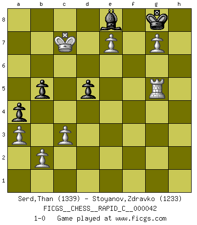 Last move : 1-0 2008 January 29 18:4:39 [Event "FICGS__CHESS__RAPID_C__000042"] [Site "FICGS"] [Date "2007.12.24"] [Round "1"] [White "Serd,Than"] [Black "Stoyanov,Zdravko"] [Result "1-0"] [WhiteElo "1339"] [BlackElo "1233"] 1.e4 e5 2.Nf3 d6 3.Bc4 Nf6 4.Ng5 d5 5.exd5 Nxd5 6.Nxf7 Kxf7 7.Qf3+ Ke6 8.Nc3 c6 9.O-O b5 10.Bb3 Bb7 11.d4 Bb4 12.Nxd5 cxd5 13.dxe5 a5 14.a3 Bc5 15.Be3 Rf8 16.Qh3+ Kf7 17.Bxc5 Re8 18.Qxh7 Nd7 19.Bd4 Nf8 20.Qh8 Qg5 21.f4 Qf5 22.Rf3 Ne6 23.Qh4 Nxd4 24.Re3 Ne6 25.g4 Rh8 26.gxf5 Rxh4 27.fxe6+ Kxe6 28.Rf1 Rf8 29.Ref3 Ke7 30.f5 Rfh8 31.R1f2 Rg4+ 32.Kf1 Rf8 33.Rf4 Rg5 34.c3 a4 35.Bc2 Ba6 36.Bd3 Rh5 37.Rg4 g5 38.fxg6 Rxf2+ 39.Kxf2 Rxh2+ 40.Kg3 Rh8 41.g7 Rg8 42.Bh7 Kf7 43.Bxg8+ Kxg8 44.e6 Bc8 45.e7 Bd7 46.Kf4 Be8 47.Ke5 Bf7 48.Kd6 Bh5 49.Rg5 Be8 50.Kc7 1-0 Philidor's defense Kingside Castling by player White (move 9) Player White won this chess game. Follow this game move after move (download)The Pin is mightier than the sword. (Fred Reinfeld) Das Schach hält seine Meister in eigenen Banden, Fesseln; auf vielerlei Weise formt es ihren Geist, so dass die innere Freiheit selbst des Stärksten beeinflusst wird. (Albert Einstein) Muchos se han convertido en Maestros de Ajedrez, nadie se ha convertido en el Maestro del Ajedrez. (Siegbert Tarrasch) La vie et les Echecs sont tous les deux une lutte constante. (Lasker) Creativity is allowing yourself to make mistakes. Art is knowing which ones to keep. (Scott Adams)