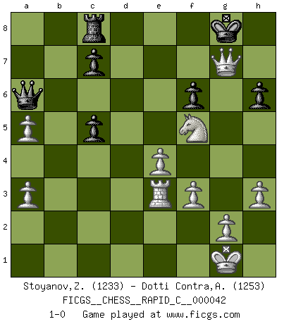 Last move : 1-0 2008 February 11 21:19:1 [Event "FICGS__CHESS__RAPID_C__000042"] [Site "FICGS"] [Date "2007.12.24"] [Round "1"] [White "Stoyanov,Zdravko"] [Black "Dotti Contra,Alessandro"] [Result "1-0"] [WhiteElo "1233"] [BlackElo "1253"] 1.e4 e5 2.Nf3 Nc6 3.Bb5 a6 4.Bxc6 bxc6 5.d3 Nf6 6.Nxe5 Qe7 7.Nf3 d5 8.O-O Bg4 9.Bg5 d4 10.Nbd2 Qe6 11.Re1 Be7 12.c4 O-O 13.Bf4 Bd6 14.e5 Bxe5 15.Bxe5 Qe7 16.Bxd4 Qd6 17.Bxf6 Qxf6 18.h3 Bh5 19.b3 c5 20.Qc2 h6 21.Ne5 Qd6 22.a3 f6 23.Nef3 Bg6 24.Re3 Rfe8 25.Ne4 Bxe4 26.dxe4 a5 27.Rd1 Qe7 28.Nh4 Qf7 29.f3 a4 30.bxa4 Rad8 31.a5 Rxd1+ 32.Qxd1 Qxc4 33.Nf5 Qa6 34.Qd7 Rc8 35.Qxg7+ 1-0 Comment by player 1 : Zdravko Stoyanov : ??????????? Ruy Lopez : Exchange variation Kingside Castling by player White (move 8) Kingside Castling by player Black (move 12) Player White won this chess game. Follow this game move after move (download)Via the squares on the chessboard, the Indians explain the movement of time and the age, the higher influences which control the world and the ties which link Chess with the human soul. (Al-Masudi) Schach ist die gewalttätigste aller Sportarten. (Garry Kasparov) Aún el Rey más flojo huye despavorido ante la amenaza de un Jaque doble. (Aaron Nimzowitsch) Donnez-moi un Cavalier en 6e et je gagnerais toutes mes parties. (Steinitz) Nobody is always a winner, and anybody who says he is, is either a liar or doesn't play poker. (Amarillo Slim)