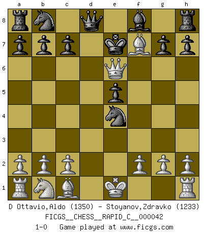 Last move : 1-0 2007 December 26 12:48:5 [Event "FICGS__CHESS__RAPID_C__000042"] [Site "FICGS"] [Date "2007.12.24"] [Round "1"] [White "D Ottavio,Aldo"] [Black "Stoyanov,Zdravko"] [Result "1-0"] [WhiteElo "1350"] [BlackElo "1233"] 1.e4 e5 2.Nf3 d6 3.d4 Bg4 4.dxe5 Bxf3 5.Qxf3 dxe5 6.Bc4 Nf6 7.Qb3 Nxe4 8.Bxf7+ Ke7 9.Qe6+ 1-0 Philidor's defense Player White won this chess game. Follow this game move after move (download)The enormous mental resilience, without which no Chess player can exist, was so much taken up by Chess that he could never free his mind of this game. (Albert Einstein) Obwohl ich alt bin, darf mir niemand den Finger in den Mund stecken, sonst beisse ich. (Wilhelm Steinitz) La batalla por la última verdad nunca sera ganada. Y es por eso que el Ajedrez es tan fascinante. (Hans Kmoch) Même un GMI sait rarement calculer sur plus de cinq coups une attaque à sacrifices. (Rudolf Spielmann) Luck is when opportunity knocks and you answer. (Anonymous)