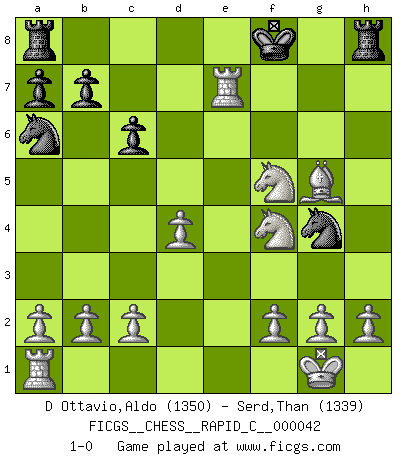 Last move : 1-0 2008 January 20 13:27:48 [Event "FICGS__CHESS__RAPID_C__000042"] [Site "FICGS"] [Date "2007.12.24"] [Round "1"] [White "D Ottavio,Aldo"] [Black "Serd,Than"] [Result "1-0"] [WhiteElo "1350"] [BlackElo "1339"] 1.e4 c6 2.d4 d5 3.Nc3 dxe4 4.Nxe4 Bf5 5.Ng3 Bg6 6.N1e2 h6 7.Nf4 Bh7 8.Bc4 Nf6 9.O-O e6 10.Re1 Be7 11.Bxe6 fxe6 12.Nxe6 Qd7 13.Nxg7+ Kf7 14.N7h5 Na6 15.Bxh6 Bg6 16.Bg5 Qg4 17.Qxg4 Nxg4 18.Rxe7+ Kf8 19.Nf4 Bf5 20.Nxf5 1-0 Caro-Kann : Classical variation Kingside Castling by player White (move 9) Player White won this chess game. Follow this game move after move (download)A win by an unsound combination, however showy, fills me with artistic horror. (Wilhelm Steinitz) Ich trinke, ich rauche, ich spiele, ich liebe Frauen aber Fernschach ist ein Laster, das ich nicht habe. (Mikhail Nekhemyevich Tal) Si un gobernante no entiende al Ajedrez, ¿como puede governar él un reinado?. (El Rey Khusros II) Il vaut mieux sacrifier les pièces de l'adversaire. (Xavier Tartacover) Statistics can be made to prove anything - even the truth. (Author unknown)