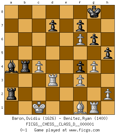 Last move : 0-1 2006 May 29 19:47:9 [Event "FICGS__CHESS__CLASS_D__000001"] [Site "FICGS"] [Date "2006.04.12"] [Round "1"] [White "Baron,Ovidiu"] [Black "Benitez,Ryan"] [Result "0-1"] [WhiteElo "1626"] [BlackElo "1400"] 1.d4 Nf6 2.c4 e6 3.Nc3 Bb4 4.Qc2 O-O 5.e4 c5 6.e5 cxd4 7.a3 Qa5 8.exf6 dxc3 9.b3 g6 10.Nf3 Nc6 11.Ra2 Bd6 12.b4 Qf5 13.Qxf5 exf5 14.Rc2 Re8+ 15.Kd1 b6 16.Rxc3 Ne5 17.Bb2 Bb7 18.Nxe5 Bxe5 19.Rc2 Bxb2 20.Rxb2 a5 21.bxa5 Rxa5 22.Rxb6 Bc6 23.Kc2 Rxa3 24.Kb2 R3a8 25.f3 Re1 26.Kc3 h5 27.Rb2 R8a1 28.Rf2 f4 29.Rg1 Re3+ 30.Kb2 Rea3 31.Rd2 Ba4 32.Rd3 R1a2+ 33.Kc1 Rc2+ 34.Kb1 R3a2 35.g4 Rcb2+ 36.Kc1 Rb4 0-1 Nimzo-Indian : Classical variation Kingside Castling by player Black (move 4) Player Black won this chess game. Follow this game move after move (download)Combinations have always been the most intriguing aspect of Chess. The masters look for them, the public applauds them, the critics praise them. It is because combinations are possible that Chess is more than a lifeless mathematical exercise. They are the poetry of the game; they are to Chess what melody is to music. They represent the triumph of mind over matter. (Reuben Fine) Dein Körper muss in Topform sein. Dein Schach verfällt, wenn dein Körper verfällt. Der Körper kann nicht vom Geist getrennt werden. (Robert James Fischer) Todo se encuentra en un estado de flujo y esto incluye al mundo del Ajedrez. (Mikhail Botvinnik) Je ne suis pas le dernier à jouer lâchement des coups douteux pendant le zeïtnot de l'adversaire pour l'achever: en effet les coups qui font le plus peur sont ceux que l'on ne comprend pas. Je me fais souvent peur quand je joue. (Un professeur anonyme) I don't believe in psychology. I believe in good moves. (Bobby Fischer)