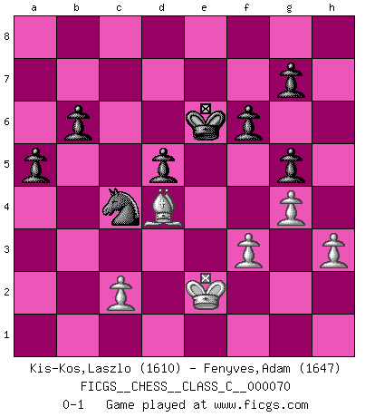 Last move : 0-1 2008 April 17 12:56:54 [Event "FICGS__CHESS__CLASS_C__000070"] [Site "FICGS"] [Date "2007.12.26"] [Round "1"] [White "Kis-Kos,Laszlo"] [Black "Fenyves,Adam"] [Result "0-1"] [WhiteElo "1610"] [BlackElo "1647"] 1.e4 d5 2.exd5 Qxd5 3.Nc3 Qa5 4.d4 Nf6 5.Nf3 Bg4 6.h3 Bh5 7.g4 Bg6 8.Ne5 e6 9.Bg2 Bb4 10.Nxg6 hxg6 11.Bxb7 Bxc3+ 12.bxc3 Qxc3+ 13.Bd2 Qxd4 14.Bxa8 Nd5 15.Bxd5 Qxd5 16.f3 Qe5+ 17.Qe2 Qxa1+ 18.Qd1 Qxa2 19.Kf2 Nc6 20.Bc3 O-O 21.Qd3 Rb8 22.Ra1 Qd5 23.Qxd5 exd5 24.Ke3 f6 25.Ba5 Rb7 26.Kd3 Kf7 27.Bc3 g5 28.Ra6 Rb6 29.Rxb6 cxb6 30.Bd2 Ne5+ 31.Ke2 a5 32.Be3 Nc4 33.Bd4 Ke6 0-1 Scandinavian defense, Lasker variation Kingside Castling by player Black (move 20) Player Black won this chess game. Follow this game move after move (download)It is peculiar but a fact nevertheless, that gamblers in chess always have enthusiastic followers. (Botvinnik) Ich verachte Kasparow. (Viktor Kortschnoi) El Ajedrez es una guerra en un tablero. El objetivo es aplastar la mente del oponente. (Bobby Fischer) Fischer est le meilleur joueur du monde et Karpov n'est qu'un joueur de bistrot. (Garry Kasparov, agé de 16 ans) You must do what you feel is right... of course. (Obi-Wan Kenobi in Star Wars ep.4)