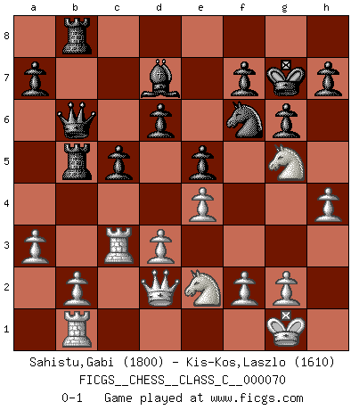Last move : 0-1 2008 May 1 21:2:43 [Event "FICGS__CHESS__CLASS_C__000070"] [Site "FICGS"] [Date "2007.12.26"] [Round "1"] [White "Sahistu,Gabi"] [Black "Kis-Kos,Laszlo"] [Result "0-1"] [WhiteElo "1800"] [BlackElo "1610"] 1.e4 c5 2.c4 Nc6 3.Nc3 d6 4.Nf3 Nf6 5.Be2 g6 6.d3 Bg7 7.h3 O-O 8.O-O Qb6 9.Na4 Qa6 10.Rb1 Bd7 11.Nc3 Nd4 12.Be3 e5 13.a3 Rab8 14.Qd2 Rfe8 15.Bh6 Nxe2+ 16.Nxe2 b5 17.Bxg7 Kxg7 18.cxb5 Bxb5 19.Rfd1 Ba4 20.Rdc1 Bb3 21.Rc3 Rb5 22.Nc1 Reb8 23.h4 Be6 24.Ng5 Bd7 25.Ne2 Qb6 0-1 Sicilian defense Kingside Castling by player Black (move 7) Kingside Castling by player White (move 8) Player Black won this chess game. Follow this game move after move (download)Fischer Chess play was always razor-sharp, rational and brilliant. One of the best ever. (Dave Regis) Es gibt keine einzige Frau, der ich nicht einen Springer vorgeben könnte und trotzdem gewänne. (Robert James Fischer) El juego de Damas es para vagabundos. (Paul Morphy) Tous ces prétendus hommes politiques sont les pions, les Cavaliers, les Tours ou les Fous d'une partie d'échecs qui se jouera tant qu'un hasard ne renversera pas l'échiquier. (Honoré de Balzac) Before all elsed, be armed. (Niccolo Machiavelli)