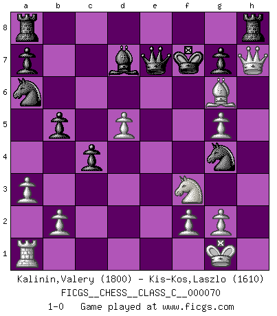 Last move : 1-0 2008 March 2 19:11:8 [Event "FICGS__CHESS__CLASS_C__000070"] [Site "FICGS"] [Date "2007.12.26"] [Round "1"] [White "Kalinin,Valery"] [Black "Kis-Kos,Laszlo"] [Result "1-0"] [WhiteElo "1800"] [BlackElo "1610"] 1.d4 Nf6 2.c4 c5 3.d5 e6 4.Nc3 exd5 5.cxd5 d6 6.Bg5 Be7 7.e4 O-O 8.h4 Ng4 9.Nf3 f5 10.Bd3 Na6 11.O-O Bxg5 12.hxg5 Nb4 13.Bb1 Bd7 14.a3 Na6 15.Qb3 fxe4 16.Nxe4 b5 17.Qd3 c4 18.Qc2 Qe7 19.Nxd6 Qxd6 20.Qxh7+ Kf7 21.Re1 Rh8 22.Re7+ Qxe7 23.Bg6+ 1-0 Benoni defense Kingside Castling by player Black (move 7) Kingside Castling by player White (move 11) Player White won this chess game. Follow this game move after move (download)Pawns: they are the soul of this game, they alone form the attack and defense. (Philidor) Im Spitzenschach von heute geht es nur um Vorbereitung, um tiefgründige, sorgfältige Eröffnungsvorbereitung. (Nigel Short) La esencia del Ajedrez es pensar acerca de lo que el Ajedrez es. (David Bronstein) Les pièces de l'échiquier étaient impitoyables. Elles le retenaient, elles l'absorbaient. Il y avait de l'horreur en cela, mais aussi une harmonie unique. Car, qu'y a-t-il dans le monde, à part les échecs ? (V. Nabokov) Life is the sum of all your choices. (Albert Camus)