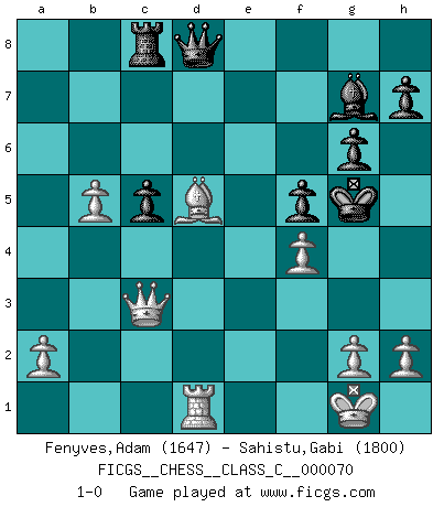 Last move : 1-0 2008 April 28 20:50:43 [Event "FICGS__CHESS__CLASS_C__000070"] [Site "FICGS"] [Date "2007.12.26"] [Round "1"] [White "Fenyves,Adam"] [Black "Sahistu,Gabi"] [Result "1-0"] [WhiteElo "1647"] [BlackElo "1800"] 1.e4 c5 2.Nf3 Nc6 3.d4 cxd4 4.Nxd4 e6 5.Nb5 d6 6.N1c3 a6 7.Nd4 g6 8.Be2 Bg7 9.Nxc6 bxc6 10.O-O Ne7 11.Be3 O-O 12.Qd3 d5 13.Rad1 Bb7 14.Na4 dxe4 15.Qa3 Qe8 16.Nc5 Bc8 17.Nxe4 Nd5 18.Bc5 f5 19.Nd6 Qd8 20.Nxc8 Qxc8 21.Bxf8 Bxf8 22.Qg3 Qb7 23.c4 Nf6 24.Qe5 Qe7 25.Bf3 Rc8 26.Rfe1 Kf7 27.b4 c5 28.b5 axb5 29.cxb5 Nd7 30.Qg3 Bg7 31.Rxe6 Qd8 32.Bd5 Nf6 33.Rxf6+ Kxf6 34.Qc3+ Kg5 35.f4+ 1-0 Sicilian defense Kingside Castling by player White (move 10) Kingside Castling by player Black (move 11) Player White won this chess game. Follow this game move after move (download)Chess is so inspiring that I do not believe a good player is capable of having an evil thought during the game. (Wilhelm Steinitz) Die unerbitterlichsten Regeln im Schach sind die Ausnahmen. (Savielly Grigorievitsch Tartakower) La maestría del Ajedrez consiste esencialmente en analizar posiciónes de Ajedrez con precisión. (Mikhail Botvinnik) Botvinnik disait en comparant les échecs à la musique: Il existe une science dont le but est l'étude de l'acoustique et des sons. Mais il y a aussi un art qui se sert de l'océan des sons : c'est la musique. De toute évidence, il en est de même pour la pensée. La logique est l'étude des lois de la réflexion et les échecs reflètent, en tant qu'art, le côté logique de la réflexion, sous la forme d'images artistiques... Extrait de Fischer - Spassky, Reykjavik 1972 par Alexander & F. Wyndham (Ed. Solar), p 37. There are three kinds of lies: lies, damned lies and statistics. (Mark Twain)