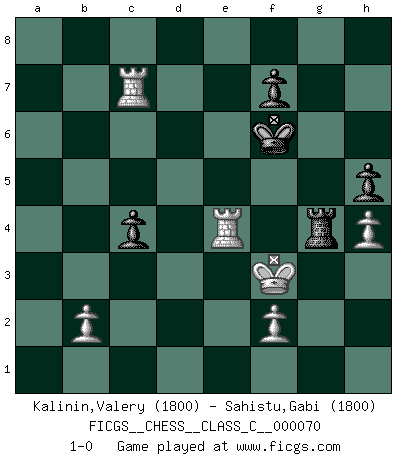 Last move : 1-0 2008 May 6 9:13:54 [Event "FICGS__CHESS__CLASS_C__000070"] [Site "FICGS"] [Date "2007.12.26"] [Round "1"] [White "Kalinin,Valery"] [Black "Sahistu,Gabi"] [Result "1-0"] [WhiteElo "1800"] [BlackElo "1800"] 1.d4 d5 2.c4 dxc4 3.Nf3 c6 4.a4 Bd7 5.e4 b5 6.axb5 cxb5 7.Nc3 e6 8.Ne5 Nf6 9.Bg5 Be7 10.Be2 h6 11.Nxd7 Qxd7 12.Bxf6 Bxf6 13.e5 Be7 14.Bf3 Nc6 15.d5 Nxe5 16.d6 Nd3+ 17.Kf1 Rb8 18.dxe7 Qxe7 19.Bc6+ Kf8 20.Bxb5 Rxb5 21.Nxb5 Qc5 22.Qf3 Kg8 23.Rxa7 Ne5 24.Qe4 g6 25.Rb7 Nc6 26.Qf3 Rh7 27.Rc7 Qxb5 28.Qxc6 Qf5 29.g3 h5 30.h4 e5 31.Kg2 e4 32.Re1 g5 33.Qxe4 Qf6 34.Qe8+ Kg7 35.Qe5 gxh4 36.Qxf6+ Kxf6 37.gxh4 Rg7+ 38.Kf3 Rg4 39.Re4 1-0 QGA : 3.Nf3 Player White won this chess game. Follow this game move after move (download)When you are lonely, when you feel yourself an alien in the world, play Chess. This will raise your spirits and be your counselor in war. (Aristotle) Du musst nicht gut spielen, es reicht, wenn du besser spielst als dein Gegner. (Anonymous) La belleza de un movimiento no se refleja solo en su apariencia, sino en el pensamiento detrás de él. (Siegbert Tarrasch) Les Echecs mettent en conflit, non pas deux intelligences, mais deux volontés. (Lasker) Every man's memory is his private literature. (Aldous Huxley)
