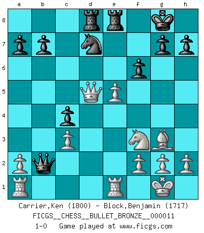 Last move : 1-0 2008 May 2 17:28:17 [Event "FICGS__CHESS__BULLET_BRONZE__000011"] [Site "FICGS"] [Date "2008.05.02"] [Round "1"] [White "Carrier,Ken"] [Black "Block,Benjamin"] [Result "1-0"] [WhiteElo "1800"] [BlackElo "1717"] 1.Nf3 Nf6 2.d4 d5 3.e3 c5 4.Bb5+ Bd7 5.Bxd7+ Nbxd7 6.O-O e6 7.c3 Bd6 8.Re1 O-O 9.Nbd2 Re8 10.e4 c4 11.e5 Nxe5 12.Nxe5 Bxe5 13.Rxe5 Nd7 14.Re1 Qc7 15.Nf3 Rad8 16.Bg5 f6 17.Bh4 e5 18.Bg3 Qb6 19.dxe5 Qxb2 20.Qxd5+ 1-0 Comment by player 1 : Ken Carrier : Does this mean I won the game by opponent resigning? Reti Opening Kingside Castling by player White (move 6) Kingside Castling by player Black (move 8) Player White won this chess game. Follow this game move after move (download)Chess mastery essentially consists of analyzing Chess positions accurately. (Mikhail Botvinnik) Ich habe die besten Aussichten, den ersten Preis zu gewinnen - denn jeder muss gegen Steinitz spielen, nur ich nicht! (Wilhelm Steinitz) Aquel que toma al Peón de Caballo de la Reina, se pasará la noche a dormir en la calle. (Anónimo) Tous ces prétendus hommes politiques sont les pions, les Cavaliers, les Tours ou les Fous d'une partie d'échecs qui se jouera tant qu'un hasard ne renversera pas l'échiquier. (Honoré de Balzac) Any activity becomes creative when the doer cares about doing it right or doing it better. (John Updike)