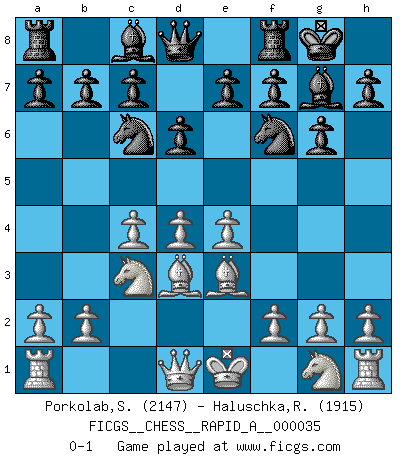 Last move : 0-1 2008 February 22 1:58:34 [Event "FICGS__CHESS__RAPID_A__000035"] [Site "FICGS"] [Date "2007.12.30"] [Round "1"] [White "Porkolab,Sandor"] [Black "Haluschka,Rainer"] [Result "0-1"] [WhiteElo "2147"] [BlackElo "1915"] 1.d4 Nf6 2.c4 g6 3.Nc3 Bg7 4.e4 O-O 5.Bd3 Nc6 6.Be3 d6 0-1 This chess game has been lost on time (started : 2007.12.30 16:20:7) King's Indian : 4.e4 Kingside Castling by player Black (move 4) Player Black won this chess game. Follow this game move after move (download)When I have White, I win because I am white; When I have Black, I win because I am Bogolyubov. (Bogolyubov) Nur ein wirklich starker Spieler weiß wie schwach er spielt. (Savielly Grigorievitsch Tartakower) El jugador táctico debe saber que hacer cuando algo se debe de hacer. El estratégico debe saber que hacer cuando nada se debe de hacer. (Savielly Tartakover) Les Echecs sont et restent toujours un combat, un combat intégral comme la boxe, la lutte ou un autre sport, et où il doit y avoir un vainqueur et un vaincu. (Joseph Emil Diemer) Inventor: A person who makes an ingenious arrangement of wheels, levers and springs, and believes it civilization. (Ambrose Bierce, The Devil's Dictionary)