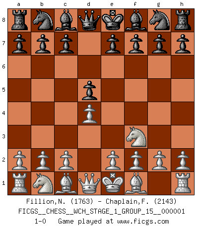 Last move : 1-0 2006 August 13 5:31:12 [Event "FICGS__CHESS__WCH_STAGE_1_GROUP_15__000001"] [Site "FICGS"] [Date "2006.07.01"] [Round "1"] [White "Fillion,Nicolas"] [Black "Chaplain,Fabrice"] [Result "1-0"] [WhiteElo "1763"] [BlackElo "2143"] 1.Nf3 d5 2.d4 1-0 This chess game has been lost on time (started : 2006.07.01 16:20:36) Reti Opening Player White won this chess game. Follow this game move after move (download)We must make sure that Chess will not be like a dead language, very interesting, but for a very small group. (Sytze Faber) Frage: Gibt es etwas was Sie mehr lieben als Autobahnen ohne Tempobegrenzungen? - Antwort: Deutsche Frauen ohne Tempobegrenzungen. (Loek van Wely) Las leyes del Ajedrez no permiten una libre elección: tienes que mover quieras o no. (Emanuel Lasker) Les erreurs sont comme les malheurs, elles n'arrivent jamais seules. (Siegbert Tarrasch) Home computers are being called upon to perform many new functions, including the consumption of homework formerly eaten by the dog. (Doug Larson)