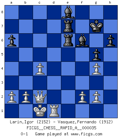 Last move : 0-1 2008 March 21 3:0:5 [Event "FICGS__CHESS__RAPID_A__000035"] [Site "FICGS"] [Date "2007.12.30"] [Round "1"] [White "Larin,Igor"] [Black "Vasquez,Fernando"] [Result "0-1"] [WhiteElo "2152"] [BlackElo "1912"] 1.e4 e5 2.Nf3 d6 3.d4 exd4 4.Nxd4 Nf6 5.Nc3 g6 6.Bg5 Bg7 7.Qd2 Nc6 8.O-O-O Nxd4 9.Qxd4 h6 10.Bh4 g5 11.Bg3 O-O 12.Qe3 Nh5 13.Bc4 Nxg3 14.hxg3 c6 15.Bb3 b5 16.e5 d5 17.Nxb5 cxb5 18.Bxd5 Bf5 19.Bxf7+ Rxf7 20.Rxd8+ Rxd8 21.Qb3 Bxe5 22.Qxb5 Re7 23.c3 Bd3 24.Qc5 Bf6 25.Rd1 Kg7 26.g4 R8d7 27.Qa5 a6 28.Qa4 Bb5 29.Qc2 Rc7 30.Rd6 Re1+ 31.Rd1 Re2 32.Rd2 Re6 33.Rd1 Rce7 34.c4 Be8 0-1 Philidor : Exchange variation Queenside Castling by player White (move 8) Kingside Castling by player Black (move 11) Player Black won this chess game. Follow this game move after move (download)A great player and a great example for many. His book My 60 Memorable Games had a big impact on me. It is a shame he didn't continue to enrich the world of chess with his unparalleled understanding after 1972. (Jan Timman, about Bobby Fischer's death) Wie, soll nun auch die Opposition abgeschafft werden? Ja, es tut mir leid, Ihnen diesen Schmerz nicht ersparen zu können. (Aaron Nimzowitsch) No hay precio que sea tan grande por la cabellera del Rey enemigo. (Koblentz) Nous sommes les pions de la mystérieuse partie d'Echecs jouée par Dieu. Il nous déplace, nous arrête, nous pousse encore, puis nous lance un à un dans la boîte du Néant. Epitaphe sur la tombe de David Janowsky (1868-1927). In God we trust, all others we virus scan. (Anonymous)
