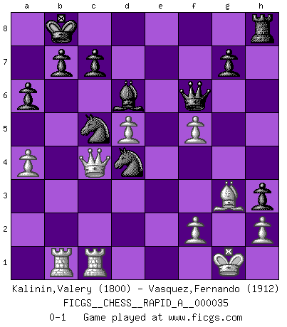 Last move : 0-1 2008 February 29 23:15:3 [Event "FICGS__CHESS__RAPID_A__000035"] [Site "FICGS"] [Date "2007.12.30"] [Round "1"] [White "Kalinin,Valery"] [Black "Vasquez,Fernando"] [Result "0-1"] [WhiteElo "1800"] [BlackElo "1912"] 1.d4 d5 2.c4 dxc4 3.Nf3 Nf6 4.Nc3 a6 5.a4 Nc6 6.e4 Bg4 7.d5 Ne5 8.Bf4 Nfd7 9.Be2 Bxf3 10.gxf3 e6 11.dxe6 fxe6 12.Bg3 Qe7 13.f4 Nc6 14.Bxc4 O-O-O 15.Qg4 Qb4 16.Bxe6 Qxb2 17.O-O h5 18.Qe2 Qxc3 19.Rfc1 Qf6 20.f5 Kb8 21.Rab1 Nc5 22.Bd5 h4 23.Bf4 Nd4 24.Qc4 Rxd5 25.exd5 h3 26.Bg3 Bd6 0-1 QGA, 4.Nc3 Queenside Castling by player Black (move 14) Kingside Castling by player White (move 17) Player Black won this chess game. Follow this game move after move (download)Chess is a sea in which a gnat may drink and an elephant may bathe. (Hindu proverb) Ich spiele ehrlich und spiele, um zu gewinnen. Wenn ich verliere nehme ich meine Medizin. (Robert James Fischer) Bobby es la celebridad menos entendida y malinterpretada que camina el la faz de esta tierra. (Yasser Seirawan) La solitude du joueur d'Echecs à l'approche du mat est semblable à celle du condamné. (Francis Szpiner) A mistake is only a mistake if you let it happen twice. Otherwise it is a learning experience. (Daniel Parmet)