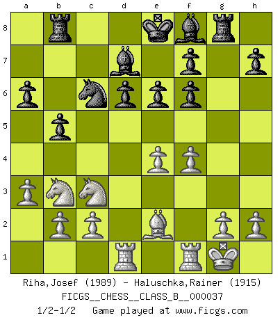 Last move : 1/2-1/2 2008 February 20 14:32:55 [Event "FICGS__CHESS__CLASS_B__000037"] [Site "FICGS"] [Date "2007.12.30"] [Round "1"] [White "Riha,Josef"] [Black "Haluschka,Rainer"] [Result "1/2-1/2"] [WhiteElo "1989"] [BlackElo "1915"] 1.e4 c5 2.Nf3 Nc6 3.d4 cxd4 4.Nxd4 d6 5.Nc3 Nf6 6.Bg5 Qb6 7.Nb3 a6 8.Be2 Ne5 9.O-O e6 10.Bxf6 gxf6 11.Qd4 Qxd4 12.Nxd4 Rg8 13.Rad1 Bd7 14.f4 Nc6 15.Nb3 b5 16.a3 Rb8 1/2-1/2 Sicilian defense Kingside Castling by player White (move 9) This chess game ended in a draw. Follow this game move after move (download)One bad move nullifies forty good ones. (Horowitz) Wenn du nicht weißt was du tun sollst, warte bis dein Gegner eine Idee hat. Sie wird sicher schlecht sein. (Siegbert Tarrasch) En la vida, como en el Ajedrez, los Peones propios obstruyen nuestro camino. La gran fortuna de un hombre, su comodidad, placer, hijos, libros, que deberían ayudarle a ganar, con mucha frecuencia lo ponen en Jaque Mate. (Charles Buxton) La tactique, c'est ce que vous faites quand il y a quelque chose à faire; la stratégie, c'est ce que vous faites quand il n'y a rien à faire. (Savielli Tartacower) Your best chance to get a Royal Flush in a casino is in the bathroom. (Anonymous)