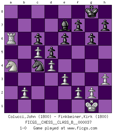 Last move : 1-0 2008 January 19 23:58:52 [Event "FICGS__CHESS__CLASS_B__000037"] [Site "FICGS"] [Date "2007.12.30"] [Round "1"] [White "Colucci,John"] [Black "Finkbeiner,Kirk"] [Result "1-0"] [WhiteElo "1800"] [BlackElo "1800"] 1.d4 d5 2.c4 c6 3.Bf4 Nf6 4.e3 Bf5 5.Nc3 e6 6.Qb3 Qb6 7.c5 Qxb3 8.axb3 Nbd7 9.h3 Be7 10.b4 O-O 11.b5 a5 12.Nf3 Ne4 13.bxc6 bxc6 14.Na4 Rab8 15.Bxb8 Rxb8 16.Be2 Rb4 17.O-O Ng5 18.Rfc1 Nxf3+ 19.Bxf3 Bd3 20.Rc3 Bb5 21.Bd1 Nf6 22.Rb3 Ne4 23.Nb6 Rxb3 24.Bxb3 g6 25.Rxa5 Nd2 26.Ba4 Bxa4 27.Nxa4 Nc4 28.Ra6 1-0 QGD Slav defense Kingside Castling by player Black (move 10) Kingside Castling by player White (move 17) Player White won this chess game. Follow this game move after move (download)In order to improve your game, you must study the endgame before everything else, for whereas the endings can be studied and mastered by themselves, the middle game and the opening must be studied in relation to the endgame. (Jose Raul Capablanca) Fischer: 'Remis!?' Uhlmann: 'Aber es muss doch dreimal Zugwiederholung sein!' Fischer: 'Sie nehmen das Remis an, wie ich es sage, sonst spiele ich weiter und werde Sie dann schlagen!' (Robert James Fischer) El muchacho (en ese entonces un niño de 12 años llamado Anatoly Karpov) no tiene ni idea de lo que es el Ajedrez y no hay futuro en absoluto para el en esta profesión. (Mikhail Botvinnik) Mais l'homme est une créature légère et illogique : semblable au joueur d'échecs, il n'aime que le processus du but à atteindre, non le but lui-même. (Dostoïevsky) I'll be back. (Arnold Schwarzenegger)