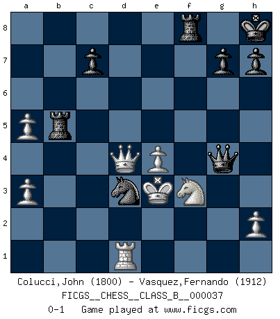 Last move : 0-1 2008 July 2 22:10:44 [Event "FICGS__CHESS__CLASS_B__000037"] [Site "FICGS"] [Date "2007.12.30"] [Round "1"] [White "Colucci,John"] [Black "Vasquez,Fernando"] [Result "0-1"] [WhiteElo "1800"] [BlackElo "1912"] 1.d4 d5 2.c4 dxc4 3.e4 e5 4.Nf3 exd4 5.Bxc4 Nc6 6.O-O Be6 7.Bxe6 fxe6 8.Qb3 Qd7 9.Qxb7 Rb8 10.Qa6 Nf6 11.Nbd2 Bd6 12.a3 O-O 13.b4 d3 14.Bb2 Rb6 15.Qc4 Ng4 16.Rad1 Be5 17.Nxe5 Ngxe5 18.Qc3 a5 19.bxa5 Rb5 20.f4 Rfb8 21.Ba1 Ng6 22.Rf3 e5 23.Rxd3 Qg4 24.Nf3 Nxf4 25.Qc4+ Kh8 26.R3d2 Nxg2 27.Kf2 Rf8 28.Rd3 Nd4 29.Bxd4 exd4 30.Qxd4 Nf4 31.Ke3 Nxd3 0-1 QGA : 3.e4 Kingside Castling by player White (move 6) Kingside Castling by player Black (move 12) Player Black won this chess game. Follow this game move after move (download)A win by an unsound combination, however showy, fills me with artistic horror. (Wilhelm Steinitz) Es ist schade, dass viele Schachsportler vergessen, wie wichtig Auftreten und angemessene Kleidung sind. (Alexandra Kosteniuk) Un mal día en el Ajedrez, es mejor que cualquier buen día en el trabajo. (Anonymous) On a dit que l'homme se distingue de l'animal par le fait qu'il achète plus de livres qu'il ne peut en lire. Je voudrais suggérer qu'inclure à la liste des livres quelques livres d'échecs rendrait la distinction manifeste. (Edward Lasker) It's not the size of the dog in the fight, it's the size of the fight in the dog. (Mark Twain)