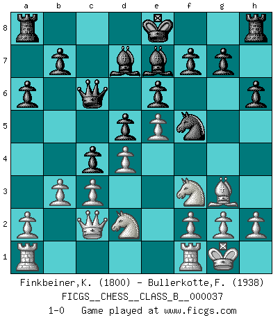 Last move : 1-0 2008 March 25 5:3:40 [Event "FICGS__CHESS__CLASS_B__000037"] [Site "FICGS"] [Date "2007.12.30"] [Round "1"] [White "Finkbeiner,Kirk"] [Black "Bullerkotte,Frank"] [Result "1-0"] [WhiteElo "1800"] [BlackElo "1938"] 1.e4 c6 2.d4 d5 3.e5 c5 4.c3 Nc6 5.Bb5 Qb6 6.Qb3 e6 7.Nf3 a6 8.Bxc6+ Qxc6 9.O-O Ne7 10.Bg5 h6 11.Bh4 Nf5 12.Bg3 Be7 13.Nbd2 c4 14.Qc2 Bd7 15.b3 1-0 This chess game has been lost on time (started : 2007.12.30 16:21:18) Caro-Kann : Advance variation Kingside Castling by player White (move 9) Player White won this chess game. Follow this game move after move (download)Chess is like war on a board. (Bobby Fischer) Spielt Blackmar-Diemer-Gambit, und das Matt kommt von selbst! (Emil Joseph Diemer) No hay otro maestro que tenga una voluntad terrífica de ganar. Al tablero, el irradía peligro y aún los oponentes mas fuertes tienden a congelarse como liebres cuando olfatean a una pantera. Aún sus debilidades son peligrosas. Con las blancas, su juego de apertura es predecible - te es posible hacer planes en su contra - pero es tan fuerte que tus planes casi nunca funcionan. En el juego medio, su precisión e invención son fabulosas y en finales, tú simplemente no le puedes vencer. (Experto Alemán anónimo) Il n'y a pas eu de défaite parce que je ne crois pas que cet ordinateur ait jamais existé. IBM a triché en refusant d'imprimer les modes de recherche de la machine. C'est évident, pendant le match, des coups décisifs ont été joués par des êtres humains. Aujourd'hui, les meilleurs spécialistes en informatique ne peuvent toujours pas expliquer comment Deep-Blue a pu jouer contre la logique des ordinateurs. IBM a gagné une guerre de communication, mais ils sont incapables de prouver que l'ordinateur a gagné tout seul. (Garry Kasparov) How many people work in NATO Headquarters ? - About half of them. (Dirk Stikker, NATO general secretary)
