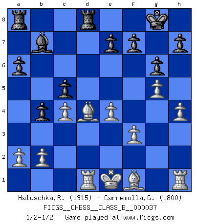 Last move : 1/2-1/2 2008 April 9 16:56:43 [Event "FICGS__CHESS__CLASS_B__000037"] [Site "FICGS"] [Date "2007.12.30"] [Round "1"] [White "Haluschka,Rainer"] [Black "Carnemolla,Giampaolo"] [Result "1/2-1/2"] [WhiteElo "1915"] [BlackElo "1800"] 1.c4 Nf6 2.Nc3 g6 3.d4 Bg7 4.e4 d6 5.g3 O-O 6.Be3 c6 7.f3 a6 8.g4 b5 9.g5 Nfd7 10.h4 b4 11.Na4 c5 12.Ne2 Nc6 13.dxc5 Nxc5 14.Nxc5 dxc5 15.Qxd8 Rxd8 16.Rb1 Nd4 17.Nxd4 Bxd4 18.Rd1 Bb7 19.Bxd4 1/2-1/2 English Opening Kingside Castling by player Black (move 5) This chess game ended in a draw. Follow this game move after move (download)The combination player thinks forward; he starts from the given position, and tries the forceful moves in his mind. (Emanuel Lasker) Mit Schach schule ich mein Gefühl für Geometrie, was für Tennis und Schach gleichermaßen wichtig ist. (Boris Becker) Un mal plan es mejor que no tener ningún plan. (Frank Marshall) Les échecs sont utiles à l'exercice de la faculté de penser et à celle de l'imagination. Car nous devons posséder une méthode élaborée pour atteindre des buts partout où nous devons conduire notre raison. (Leibnitz) The faster the computer, the slower the brain. (Thibault de Vassal)