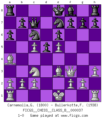 Last move : 1-0 2008 March 29 5:19:14 [Event "FICGS__CHESS__CLASS_B__000037"] [Site "FICGS"] [Date "2007.12.30"] [Round "1"] [White "Carnemolla,Giampaolo"] [Black "Bullerkotte,Frank"] [Result "1-0"] [WhiteElo "1800"] [BlackElo "1938"] 1.e4 c6 2.d4 d5 3.e5 c5 4.dxc5 Nc6 5.Nf3 Bg4 6.Bb5 Qa5+ 7.Nc3 e6 8.Bd2 Qc7 9.Be3 Nge7 10.h3 Bxf3 11.Qxf3 a6 12.Ba4 1-0 This chess game has been lost on time (started : 2007.12.30 16:21:18) Caro-Kann : Advance variation Player White won this chess game. Follow this game move after move (download)Weak points or holes in the opponent's position must be occupied by pieces not Pawns. (Siegbert Tarrasch) Jeder weiß, dass Gasprom Putins persönliches Machtinstrument ist. Die Firma wird vom Kreml aus geleitet und wird schon deshalb nie transparent sein. (Garry Kasparov) Las Aperturas te enseñan aperturas. ¡Los Finales te enseñan Ajedrez!. (Stephan Gerzadowicz) Le thème de l'attaque double intervient d'une manière ou d'une autre dans l'immense majorité des combinaisons. (Youri Averbakh) A proverb is a short sentence based on long experience. (Miguel de Cervantes)