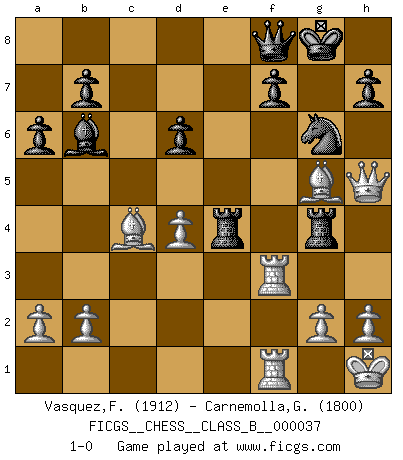 Last move : 1-0 2008 March 12 16:12:57 [Event "FICGS__CHESS__CLASS_B__000037"] [Site "FICGS"] [Date "2007.12.30"] [Round "1"] [White "Vasquez,Fernando"] [Black "Carnemolla,Giampaolo"] [Result "1-0"] [WhiteElo "1912"] [BlackElo "1800"] 1.e4 e5 2.Nf3 Nc6 3.d4 exd4 4.Nxd4 Bc5 5.Be3 Qf6 6.c3 Nge7 7.Bc4 O-O 8.O-O d6 9.f4 Be6 10.Be2 Bb6 11.Qd2 a6 12.Na3 Rfe8 13.Rf2 Nxd4 14.cxd4 g6 15.Nc4 Bxc4 16.Bxc4 Rf8 17.f5 gxf5 18.Rd1 Rae8 19.Rf3 d5 20.exd5 Ng6 21.Bg5 Qd6 22.Rxf5 Re4 23.Bf6 Rfe8 24.Kh1 Qf8 25.Rdf1 Qd6 26.R5f3 Rg4 27.Qh6 Qf8 28.Qh5 R8e4 29.d6 cxd6 30.Bg5 1-0 Scotch game Kingside Castling by player Black (move 7) Kingside Castling by player White (move 8) Player White won this chess game. Follow this game move after move (download)Different people feel differently about resigning. (Bobby Fischer) Ein typischer, sehr verbreiteter Gedankenschädling ist der, daß der betreffende Amateur von der Annanhme ausgeht, daß jeder einzelne Zug etwas zu leisten habe. (Aaron Nimzowitsch) El Ajedrez no es una pizca de inferior al violín, y tenemos un gran número de violinistas profesionales. (Mikhail Botvinnik) La solitude du joueur d'Echecs à l'approche du mat est semblable à celle du condamné. (Francis Szpiner) When you've done things right people won't know you've done anything at all. (Futurama)