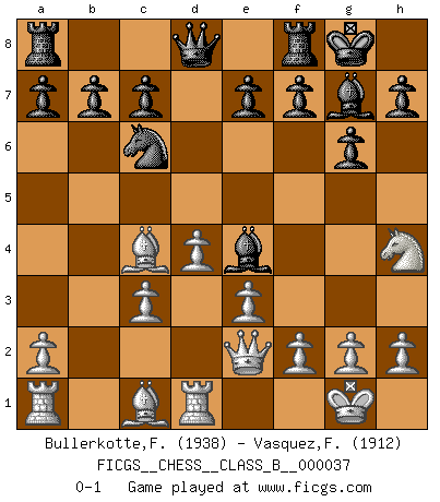 Last move : 0-1 2008 March 31 6:39:11 [Event "FICGS__CHESS__CLASS_B__000037"] [Site "FICGS"] [Date "2007.12.30"] [Round "1"] [White "Bullerkotte,Frank"] [Black "Vasquez,Fernando"] [Result "0-1"] [WhiteElo "1938"] [BlackElo "1912"] 1.d4 d5 2.c4 dxc4 3.Nf3 Nf6 4.e3 g6 5.Bxc4 Bg7 6.O-O O-O 7.Nc3 Nc6 8.Qe2 Bf5 9.Rd1 Ne4 10.Nh4 Nxc3 11.bxc3 Be4 0-1 This chess game has been lost on time (started : 2007.12.30 16:21:18) QGA, Smyslov variation Kingside Castling by player White (move 6) Kingside Castling by player Black (move 6) Player Black won this chess game. Follow this game move after move (download)If a ruler does not understand Chess, how can he rule over a kingdom ? (King Khusros II) Ein Remis kann durch Wiederholung von drei Zügen oder durch einen schlechte Zug erreicht werden. (Savielly Grigorievitsch Tartakower) En la perfecta combinación de Ajedrez como en una historia corta de primera clase, toda la trama y contra trama deberá conducir hacia un final sorprendente, el interes no es mitigado hasta el último momento. (Yates and Winter) Le temps de noter son nom sur la feuille de partie, j'étais déjà en zeitnot ! D'un modeste amateur apparié lors de la première ronde d'un open contre le grand-maître Azmaïparashvili. I know the human being and fish can coexist peacefully. (George W. Bush, Saginaw sept. 29, 2000)