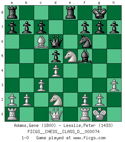 Last move : 1-0 2008 January 21 1:6:56 [Event "FICGS__CHESS__CLASS_D__000074"] [Site "FICGS"] [Date "2007.12.30"] [Round "1"] [White "Adams,Gene"] [Black "Lesslie,Peter"] [Result "1-0"] [WhiteElo "1800"] [BlackElo "1433"] 1.e4 e6 2.Bc4 d5 3.exd5 exd5 4.Be2 Nf6 5.h3 Bc5 6.d4 Bb4+ 7.Bd2 Bxd2+ 8.Nxd2 O-O 9.Ngf3 Nc6 10.c3 Re8 11.O-O Bf5 12.Bb5 Qd7 13.Ne5 Qd6 14.Bxc6 1-0 French defense Kingside Castling by player Black (move 8) Kingside Castling by player White (move 11) Player White won this chess game. Follow this game move after move (download)I still hope to kill Fischer. (Boris Spassky) Es liegt in der Natur, vernüftig zu denken und unlogisch zu handeln. (Anatole France) El Ajedrez tiene tanto misterio como las mujeres. (Purdy) Karpov est une pièce de musée. (Garry Kasparov) Everything in life is luck. (Donald Trump)