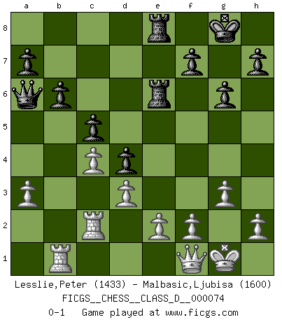 Last move : 0-1 2008 January 21 1:6:49 [Event "FICGS__CHESS__CLASS_D__000074"] [Site "FICGS"] [Date "2007.12.30"] [Round "1"] [White "Lesslie,Peter"] [Black "Malbasic,Ljubisa"] [Result "0-1"] [WhiteElo "1433"] [BlackElo "1600"] 1.g3 g6 2.Bg2 Bg7 3.Nf3 Nf6 4.O-O O-O 5.c4 d5 6.cxd5 Nxd5 7.Nc3 Nxc3 8.bxc3 c6 9.Rb1 e5 10.Qc2 Qc7 11.d3 b6 12.Bb2 Bb7 13.Rfc1 c5 14.c4 Nc6 15.a3 Nd4 16.Nxd4 exd4 17.Bxb7 Qxb7 18.Qd1 Rfe8 19.Qf1 Bh6 20.Re1 Re6 21.Bc1 Bxc1 22.Rexc1 Rae8 23.Rc2 Qa6 0-1 Benko's Opening Kingside Castling by player White (move 4) Kingside Castling by player Black (move 4) Player Black won this chess game. Follow this game move after move (download)I like the moment when I break a man's ego. (Bobby Fischer) Im Internet Chess Club betrug mein Rating vorübergehend 3350 ELO-Punkte. (Sergej Karjakin) Juega la Apertura como un libro, el Juego Medio como un mago y los Finales como una máquina. (Spielmann) Le jeu d'échecs fait naître et fortifie en nous plusieurs qualités précieuses dans le cours de l'existence, telles que la prévoyance, la circonspection, la prudence, et la persévérance. (Benjamin Franklin - 1783, la morale des échecs) Excelling at chess has long been considered a symbol of more general intelligence. That is an incorrect assumption in my view, as pleasant as it might be. But for the purposes of argument and investigation, chess is, in Russkin-Gutman's words, 'an unparalleled laboratory, since both the learning process and the degree of ability obtained can be objectified and quantified, providing an excellent comparative framework on which to use rigorous analytical techniques.' (The Chess Master and the Computer, by Garry Kasparov - 2010)