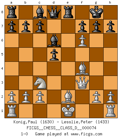 Last move : 1-0 2008 January 21 1:6:42 [Event "FICGS__CHESS__CLASS_D__000074"] [Site "FICGS"] [Date "2007.12.30"] [Round "1"] [White "Konig,Paul"] [Black "Lesslie,Peter"] [Result "1-0"] [WhiteElo "1630"] [BlackElo "1433"] 1.f3 d5 2.d4 Nc6 3.Nc3 Nf6 4.e4 dxe4 5.d5 Ne5 6.fxe4 e6 7.Nf3 Bd6 8.Bf4 Nxf3+ 9.Qxf3 O-O 10.e5 exd5 11.exf6 Re8+ 12.Be2 1-0 Gedult's Opening Kingside Castling by player Black (move 9) Player White won this chess game. Follow this game move after move (download)What is the difference between chess and football? Everybody understands football, but nobody plays it. Everybody plays chess, but nobody understands it. Everything is relative. (Vladimir Kramnik) Weshalb minderdergeübte Spieler mit g2-g4 beginnen? Die betreffenden sind unschlüssig, ob sie nun rechts (h4) oder links (f4) beginnen sollen, und in ihrer Ratlosigkeit entschliessen sie sich nach guter Bürgerart dazu, den goldenen Mittelweg zu wählen. (Aaron Nimzowitsch) Tu cuerpo tiene que estar en óptima condición. Tu Ajedrez se deteriora como lo hace tu cuerpo. No puedes separar la mente y el cuerpo. (Bobby Fischer) L'action d'une oeuvre littéraire se déroule sur un champ de bataille. Les masques et les types du drame moderne correspondent aux pièces du jeu d'échecs. L'intrigue correspond aux coups et aux gambits, c'est à dire aux techniques du jeu telles qu'utilisées et interprétées par les joueurs. Les tactiques et les péripéties [mouvements] correspondent aux coups exécutés par l'adversaire. (Viktor Shklovsky) A cynic is a man who knows the price of everything but the value of nothing. (Oscar Wilde)