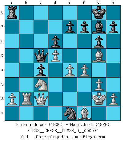 Last move : 0-1 2008 March 13 12:24:4 [Event "FICGS__CHESS__CLASS_D__000074"] [Site "FICGS"] [Date "2007.12.30"] [Round "1"] [White "Florea,Oscar"] [Black "Mazo,Joel"] [Result "0-1"] [WhiteElo "1800"] [BlackElo "1526"] 1.d4 Nf6 2.c4 c5 3.d5 b5 4.cxb5 a6 5.bxa6 Bxa6 6.Nc3 d6 7.Nf3 g6 8.g3 Bg7 9.Bg2 O-O 10.O-O Nbd7 11.Re1 Qc7 12.e4 Rfb8 13.Rb1 Ng4 14.Qc2 Nge5 15.Bg5 Bd3 16.Qd2 Bxb1 17.Rxb1 Nc4 18.Qc1 Nde5 19.Nxe5 Nxe5 20.Qc2 c4 21.f4 Nd3 22.Bf1 Qc5+ 23.Kg2 Rxb2 24.Rxb2 Ne1+ 0-1 Benko gambit accepted Kingside Castling by player Black (move 9) Kingside Castling by player White (move 10) Player Black won this chess game. Follow this game move after move (download)Chess is a terrible game. If you have no center, your opponent has a freer position. If you do have a center, then you really have something to worry about ! (Siegbert Tarrasch) Ein Isolani verdüstert die Stimmung auf dem ganzen Schachbrett. (Savielly Grigorievitsch Tartakower) No soy una persona materialista y por eso, no resiento la falta o pérdida del dinero. La ausencia de cosas mundanas carece de importancia. Ya que el Ajedrez es una forma en la que puedo ser tan materialista como yo desee sin tener la necesidad de vender mi alma. (Jamie Walter Adams) Le joueur d'Echecs qui veut atteindre le top est obligé de développer son propre credo créatif. Alexeï Stepanovicth Souétine. Il est facile d'écrire des livres ! Ce qui est difficile, c'est de jouer ! (Alexeï Stepanovicth Souétine) Experiences are the keys to life. (Daniel Parmet)