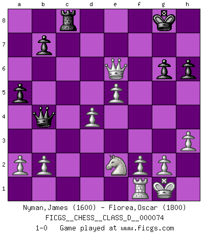 Last move : 1-0 2008 February 3 16:13:35 [Event "FICGS__CHESS__CLASS_D__000074"] [Site "FICGS"] [Date "2007.12.30"] [Round "1"] [White "Nyman,James"] [Black "Florea,Oscar"] [Result "1-0"] [WhiteElo "1600"] [BlackElo "1800"] 1.d4 d5 2.Nf3 c6 3.e3 Bg4 4.c4 Nf6 5.h3 Bxf3 6.Qxf3 e6 7.Nc3 dxc4 8.Bxc4 Nbd7 9.O-O Nb6 10.Bd3 g6 11.Bd2 Bg7 12.Rac1 O-O 13.Ne2 Rc8 14.e4 Re8 15.Bg5 h6 16.Bh4 Qd7 17.Bxf6 c5 18.Bxg7 Kxg7 19.Rxc5 Na4 20.Bb5 Qd6 21.Rxc8 Rxc8 22.Bxa4 a6 23.e5 Qb4 24.Bb3 a5 25.Qf6+ Kg8 26.Bxe6 fxe6 27.Qxe6+ 1-0 Queen's pawn game Kingside Castling by player White (move 9) Kingside Castling by player Black (move 12) Player White won this chess game. Follow this game move after move (download)Bobby just drops the pieces and they fall on the right squares. (Miguel Najdorf) Früher wurde jeder komplizierte Zug, jedes interessante Opfer mit großem Beifall und Enthusiasmus aufgenommen. Heute schaltet man einfach seinen Fritz an, und man kann sehen, was los ist, ob der Zug geht oder nicht. (Vladimir Kramnik) Uno por uno, yo los acribillé, mi superioridad muy pronto se volvio aparente. (Jose Capablanca) Mais n'est-ce pas déjà le limiter injurieusement que d'appeler les échecs un jeu? N'est-ce pas aussi une science, un art, ou quelque chose qui, comme le cercueil de Mahomet entre ciel et terre, est suspendu entre l'un et l'autre, et qui réunit un nombre incroyable de contraires ? (Stefan Zweig) Treat your password like your toothbrush. Don't let anybody else use it, and get a new one every six months. (Clifford Stoll)