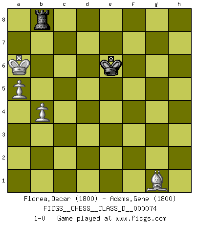 Last move : 1-0 2008 May 26 13:2:58 [Event "FICGS__CHESS__CLASS_D__000074"] [Site "FICGS"] [Date "2007.12.30"] [Round "1"] [White "Florea,Oscar"] [Black "Adams,Gene"] [Result "1-0"] [WhiteElo "1800"] [BlackElo "1800"] 1.d4 Nf6 2.c4 d6 3.Nc3 h6 4.e4 b6 5.f3 c5 6.Be3 cxd4 7.Bxd4 Nc6 8.Be3 e5 9.Qd2 Be7 10.Bd3 Nd4 11.Nge2 Nxe2 12.Bxe2 Bd7 13.O-O-O O-O 14.g4 a6 15.h4 Rb8 16.g5 Nh7 17.gxh6 g6 18.h5 g5 19.Rdg1 f6 20.Nd5 b5 21.Rd1 bxc4 22.Nxe7+ Qxe7 23.Qxd6 Qxd6 24.Rxd6 Bb5 25.Rhd1 Rbc8 26.Kb1 c3 27.Bxb5 c2+ 28.Ka1 cxd1Q+ 29.Rxd1 axb5 30.Rd7 Rc6 31.a3 f5 32.Rg7+ Kh8 33.Bxg5 f4 34.Be7 Rg8 35.Bb4 Rxh6 36.Rb7 Rxh5 37.Rxb5 Ng5 38.Rxe5 Rh1+ 39.Ka2 Nxf3 40.Bc3 Nxe5 41.Bxe5+ Kh7 42.Bxf4 Re1 43.e5 Re2 44.a4 Kg6 45.a5 Re4 46.Bd2 Rxe5 47.Bc3 Re2 48.Ka3 Ra8 49.Ka4 Re4+ 50.b4 Rc4 51.Be5 Kf5 52.Bd6 Rc1 53.Kb5 Ke6 54.Bc5 Rb8+ 55.Ka6 Rg1 56.Bxg1 1-0 Old Indian defense Queenside Castling by player White (move 13) Kingside Castling by player Black (move 13) Promotion Queen by player Black (move 28) 10 pieces endgame at move 40 : White KBPPP , Black KRRNP WHITE : King + 1 Bishop 3 Pawns BLACK : King + 2 Rooks 1 Knight 1 Pawn 9 pieces endgame at move 41 : White KBPPP , Black KRRP WHITE : King + 1 Bishop 3 Pawns BLACK : King + 2 Rooks 1 Pawn 8 pieces endgame at move 42 : White KBPPP , Black KRR WHITE : King + 1 Bishop 3 Pawns BLACK : King + 2 Rooks 7 pieces endgame at move 46 : White KBPP , Black KRR WHITE : King + 1 Bishop 2 Pawns BLACK : King + 2 Rooks 6 pieces endgame at move 56 : White KBPP , Black KR WHITE : King + 1 Bishop 2 Pawns BLACK : King + 1 Rook Player White won this chess game. Follow this game move after move (download)A man that will take back a move at Chess will pick a pocket. (Richard Fenton) Ich liebe den Moment, wenn ich das Ego meines Gegenüber breche. (Robert James Fischer) Si no le temes a Spassky, entonces elimino el elemento del dinero. (Jim Slater) Vous m'avez demandé de vous exposer quel est le fondement de la prière. Je ne fais que préparer les pièces du jeu sur la table... Nous sera-t-il permis d'en adopter les règles et si nous les appliquons scrupuleusement nous ne tarderons pas à faire mat le Roi divin ! Il ne pourra échapper à nos mains. (Sainte Thérèse d'Avila, Chemin de perfection) The best teachers teach from the heart, not from the book. (Author unknown)