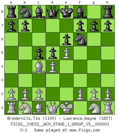 Last move : 0-1 2006 August 6 3:55:54 [Event "FICGS__CHESS__WCH_STAGE_1_GROUP_15__000001"] [Site "FICGS"] [Date "2006.07.01"] [Round "1"] [White "Bredernitz,Tim"] [Black "Lowrance,Wayne"] [Result "0-1"] [WhiteElo "1100"] [BlackElo "1827"] 1.e4 c5 2.Bc4 e6 3.d4 Nf6 4.e5 d5 0-1 This chess game has been lost on time (started : 2006.07.01 16:20:36) Sicilian defense Player Black won this chess game. Follow this game move after move (download)The passion for playing Chess is one of the most unaccountable in the world. (H.G. Wells) Nie in meinem Leben habe ich die französische Verteidigung gespielt, welche die Stumpfsinnigste von allen ist. (Wilhelm Steinitz) Observen a Garry Kasparov. Después de una derrota, invariablemente el gana la próxima partida. Prácticamente hace pedazos a su siguiente oponente. Eso es algo que tenemos que aprender a lograr. (Maurice Ashley) Celui qui prend des risques peut perdre, celui qui n'en prend pas perd toujours. (Xavier Tartacover) Somewhere in the world there is an epigram for every dilemma. (Hendrik Willem van Loon)