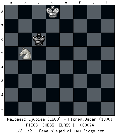 Last move : 1/2-1/2 2008 April 5 11:52:24 [Event "FICGS__CHESS__CLASS_D__000074"] [Site "FICGS"] [Date "2007.12.30"] [Round "1"] [White "Malbasic,Ljubisa"] [Black "Florea,Oscar"] [Result "1/2-1/2"] [WhiteElo "1600"] [BlackElo "1800"] 1.d4 d5 2.Nf3 c6 3.e3 Bg4 4.Nbd2 Nf6 5.c4 e6 6.Be2 Nbd7 7.O-O dxc4 8.Nxc4 b5 9.Ncd2 g6 10.h3 Bxf3 11.Bxf3 Qc7 12.a3 Rc8 13.b4 Bg7 14.Bb2 O-O 15.Rc1 Rfe8 16.Rxc6 Qb8 17.Qe2 Rxc6 18.Bxc6 Rc8 19.Bxb5 Rc2 20.Bc1 Qc7 21.Bxd7 Rxc1 22.Bb5 Nd5 23.Rxc1 Qxc1+ 24.Nf1 Qxa3 25.Qc4 Qxb4 26.Qxb4 Nxb4 27.Nd2 Nd5 28.Nb3 Bf8 29.Kf1 a5 30.Nxa5 Kg7 31.Bc6 Kf6 32.Bxd5 exd5 33.Ke2 Ke6 34.Kd3 Bb4 35.Nb3 Be1 36.f4 f5 37.Nc5+ Kd6 38.Ke2 Bh4 39.Kf3 h6 40.g4 Be7 41.Nd3 Ke6 42.Ne5 g5 43.Nc6 Bf6 44.gxf5+ Kxf5 45.Nb4 gxf4 46.Nxd5 fxe3 47.Nxe3+ Ke6 48.Ke4 Bg5 49.Nf5 Bd2 50.h4 Kf6 51.d5 h5 52.Ng3 Kg6 53.d6 Ba5 54.Kd5 Bd8 55.Ke6 Bxh4 56.Nf5 Bd8 57.Ne7+ Kg7 58.Kd7 Ba5 59.Kc8 h4 60.Nf5+ Kf6 61.Nxh4 Ke6 62.d7 Bb6 63.Nf3 Ba5 64.Nd4+ Kd6 65.Nb5+ Kc6 66.Nd4+ Kd6 67.Nb5+ Kc6 68.d8Q Bxd8 69.Kxd8 1/2-1/2 Queen's pawn game Kingside Castling by player White (move 7) Kingside Castling by player Black (move 14) 10 pieces endgame at move 45 : White KNPPP , Black KBPPP WHITE : King + 1 Knight 3 Pawns BLACK : King + 1 Bishop 3 Pawns 9 pieces endgame at move 46 : White KNPPP , Black KBPP WHITE : King + 1 Knight 3 Pawns BLACK : King + 1 Bishop 2 Pawns 8 pieces endgame at move 46 : White KNPP , Black KBPP WHITE : King + 1 Knight 2 Pawns BLACK : King + 1 Bishop 2 Pawns 7 pieces endgame at move 47 : White KNPP , Black KBP WHITE : King + 1 Knight 2 Pawns BLACK : King + 1 Bishop 1 Pawn 6 pieces endgame at move 55 : White KNP , Black KBP WHITE : King + 1 Knight 1 Pawn BLACK : King + 1 Bishop 1 Pawn 5 pieces endgame at move 61 : White KNP , Black KB WHITE : King + 1 Knight 1 Pawn BLACK : King + 1 Bishop Promotion Queen by player White (move 68) 4 pieces endgame at move 68 : White KN , Black KB WHITE : King + 1 Knight BLACK : King + 1 Bishop 3 pieces endgame at move 69 : White KN , Black K WHITE : King + 1 Knight BLACK : King + This chess game ended in a draw. Follow this game move after move (download)Chess is a terrible game. If you have no center, your opponent has a freer position. If you do have a center, then you really have something to worry about ! (Siegbert Tarrasch) Im Wettkampf zwischen starken Meistern kommen Fehler sehr selten vor, deshalb ist es mit bloßem Warten nicht getan. (José Raúl Capablanca) La táctica fluye a partir de una posición superior. (Bobby Fischer) Les écrivains ont utilisé les échecs pour analyser les côtés extrêmes de la nature humaine. Dans ce cadre, les échecs offrent un champ d'expérimentation idéal. Mais on pourrait faire la même chose avec la peinture. Et là, en vous référant à Van Gogh, vous ne tirerez pas de conclusion définitive sur les peintres. (Gary Kasparov) Every now and then a man's mind is stretched by a new idea and never shrinks back to its former dimensions. (Oliver Wendell Holmes, Sr.)