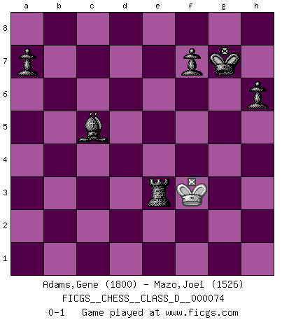 Last move : 0-1 2008 May 12 11:48:41 [Event "FICGS__CHESS__CLASS_D__000074"] [Site "FICGS"] [Date "2007.12.30"] [Round "1"] [White "Adams,Gene"] [Black "Mazo,Joel"] [Result "0-1"] [WhiteElo "1800"] [BlackElo "1526"] 1.e4 e5 2.Nf3 Nf6 3.d3 Nc6 4.a3 d5 5.Be2 dxe4 6.dxe4 Qxd1+ 7.Bxd1 Nxe4 8.O-O Bd6 9.c3 Nf6 10.h3 O-O 11.Bg5 e4 12.Nh4 h6 13.Bxf6 gxf6 14.Nd2 f5 15.f3 Be7 16.g3 e3 17.Nb3 f4 18.Be2 fxg3 19.Ng2 Bxh3 20.Rfe1 Be6 21.Nd4 Nxd4 22.cxd4 Bf6 23.Red1 Rad8 24.Rac1 Bxd4 25.Rxc7 Bxb2 26.Rxd8 Rxd8 27.Rxb7 Rd2 28.Kf1 Bh3 29.Re7 Bxg2+ 30.Kxg2 Rxe2+ 31.Kxg3 Bxa3 32.Re8+ Kg7 33.Ra8 Bd6+ 34.f4 Rf2 35.Re8 Rxf4 36.Rxe3 Re4 37.Kf2 Bc5 38.Kf3 Rxe3+ 0-1 Petrov's defense Kingside Castling by player White (move 8) Kingside Castling by player Black (move 10) 10 pieces endgame at move 31 : White KRP , Black KRBPPPP WHITE : King + 1 Rook 1 Pawn BLACK : King + 1 Rook 1 Bishop 4 Pawns 9 pieces endgame at move 35 : White KR , Black KRBPPPP WHITE : King + 1 Rook BLACK : King + 1 Rook 1 Bishop 4 Pawns 8 pieces endgame at move 36 : White KR , Black KRBPPP WHITE : King + 1 Rook BLACK : King + 1 Rook 1 Bishop 3 Pawns 7 pieces endgame at move 38 : White K , Black KRBPPP WHITE : King + BLACK : King + 1 Rook 1 Bishop 3 Pawns Player Black won this chess game. Follow this game move after move (download)If Chess is a science, it's a most inexact one. If Chess is an art, it is too exacting to be seen as one. If Chess is a sport, it's too esoteric. If Chess is a game, it's too demanding to be just a game. If Chess is a mistress, she's a demanding one. If Chess is a passion, it's a rewarding one. If Chess is life, it's a sad one. (Unknown) Wer wird heute Abend ihr Gegner sein? -- Heute Abend spiele ich gegen die schwarzen Steine. (Akiba Rubinstein) El jugador táctico sabe que hacer cuando hay algo que hacer; mientras que el estratega sabe que hacer cuando no hay nada que hacer. (Gerald Abrahams) Les réformistes prétendent que les progrès de la théorie conduiront à la disparition des échecs, et qu'il faut, pour leur rendre vie, en remanier les règles. En réalité, qu'exprime cette affirmation? Le mépris de l'intuition, de l'imagination et de tous les autres éléments qui font des échecs un art. (Alexander Alekhine) Knowledge rests not upon truth alone, but upon error also. (Carl G. Jung)
