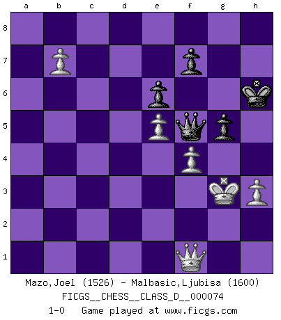 Last move : 1-0 2008 May 14 7:36:16 [Event "FICGS__CHESS__CLASS_D__000074"] [Site "FICGS"] [Date "2007.12.30"] [Round "1"] [White "Mazo,Joel"] [Black "Malbasic,Ljubisa"] [Result "1-0"] [WhiteElo "1526"] [BlackElo "1600"] 1.e4 c5 2.Nf3 d6 3.d4 cxd4 4.Nxd4 Nc6 5.c4 e6 6.Nc3 a6 7.Be3 Nf6 8.Be2 Be7 9.f4 O-O 10.O-O Qc7 11.Nb3 Bd7 12.Kh1 Rad8 13.g4 Bc8 14.g5 Nd7 15.Rc1 b6 16.Bf3 Bb7 17.Qd2 Nc5 18.Rfd1 Nxb3 19.axb3 Nb4 20.Qf2 Qb8 21.Bxb6 Rc8 22.Ba5 Nc6 23.Bb6 Nb4 24.Na4 d5 25.e5 g6 26.cxd5 Nxd5 27.Nc5 Bxc5 28.Bxc5 Rfd8 29.Be3 Nxe3 30.Qxe3 Rxc1 31.Rxc1 Bd5 32.Bxd5 Rxd5 33.Kg2 Qb7 34.Kg3 Rb5 35.Rc3 a5 36.Qf3 Qb6 37.Kg2 a4 38.Qa8+ Kg7 39.Qxa4 Rb4 40.Qd7 Rxb3 41.Rxb3 Qxb3 42.Qd2 Qb7+ 43.Kg3 Qb3+ 44.Kg4 h5+ 45.gxh6+ Kh7 46.h3 Qb7 47.b4 Qh1 48.b5 Qb7 49.Qe2 Kxh6 50.Kh4 Qb6 51.Qf1 Qd4 52.Kg4 Qe4 53.b6 Qf5+ 54.Kg3 g5 55.b7 1-0 Sicilian Kingside Castling by player Black (move 9) Kingside Castling by player White (move 10) Player White won this chess game. Follow this game move after move (download)The blunders are all there on the board, waiting to be made. (Savielly Tartakover) Ein Teil des Fehlers ist immer korrekt. (Savielly Grigorievitsch Tartakower) La estratégia requiere pensar, la táctica requiere observación. (Max Euwe) Seul un grand joueur sait à quel point il joue faiblement. (Xavier Tartacover) We need strong personalities and only one world champion to attract sponsors. (Anatoly Karpov)