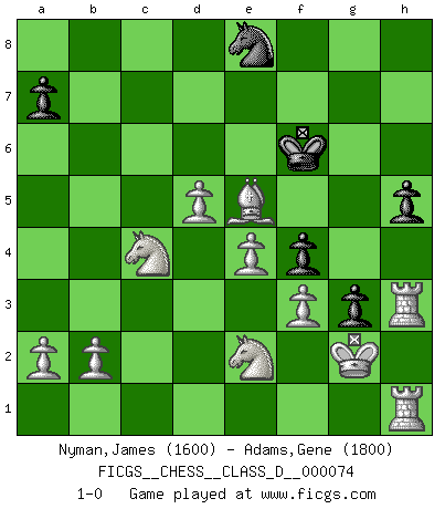 Last move : 1-0 2008 January 19 10:20:34 [Event "FICGS__CHESS__CLASS_D__000074"] [Site "FICGS"] [Date "2007.12.30"] [Round "1"] [White "Nyman,James"] [Black "Adams,Gene"] [Result "1-0"] [WhiteElo "1600"] [BlackElo "1800"] 1.c4 e5 2.g3 Bc5 3.Bg2 Qf6 4.e3 d6 5.Ne2 Be6 6.Bxb7 Nh6 7.Bxa8 O-O 8.Bd5 Bxd5 9.cxd5 Ng4 10.O-O Qh6 11.h4 g5 12.f3 Nf6 13.d4 gxh4 14.e4 Qg6 15.dxc5 hxg3 16.Kg2 Nh5 17.Qd2 Nd7 18.c6 f5 19.Qg5 Qxg5 20.Bxg5 f4 21.cxd7 Ng7 22.d8Q Rxd8 23.Bxd8 h6 24.Bxc7 Ne8 25.Bb8 h5 26.Nd2 Kg7 27.Rh1 Kg6 28.Rh3 Kg5 29.Rah1 Ng7 30.Bxd6 Kf6 31.Nc4 Ne8 32.Bxe5+ 1-0 English Opening Kingside Castling by player Black (move 7) Kingside Castling by player White (move 10) Promotion Queen by player White (move 22) Player White won this chess game. Follow this game move after move (download)It is the aim of the modern school, not to treat every position according to one general law, but according to the principle inherent in the position. (Richard Reti) Alles was ich jemals tun will ist Schach spielen. (Robert James Fischer) Te sientas frente a un tablero y repentinamente tu corazón brinca. Tu mano tiembla al tomar una pieza y moverla. Pero lo que el Ajedrez te enseña es que tu debes permanecer ahí con calma y pensar de que si realmente es una buena idea o de que si hay otras ideas mejores. (Stanley Kubrick) Le système Elo représente seulement une moyenne. Il est simplement un indicateur de votre stabilité. (Anatoli Karpov) When you stop learning you start dying. (Scott Adams)