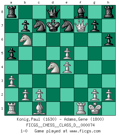 Last move : 1-0 2008 January 13 11:59:15 [Event "FICGS__CHESS__CLASS_D__000074"] [Site "FICGS"] [Date "2007.12.30"] [Round "1"] [White "Konig,Paul"] [Black "Adams,Gene"] [Result "1-0"] [WhiteElo "1630"] [BlackElo "1800"] 1.f3 Nc6 2.d4 d5 3.Nc3 h6 4.e4 e6 5.Bb5 Nge7 6.Nge2 Bd7 7.O-O a6 8.Bd3 e5 9.exd5 Nb4 10.Be4 Bf5 11.dxe5 Bxe4 12.fxe4 a5 13.a3 Na6 14.Nd4 c6 15.Qf3 cxd5 16.Qxf7+ Kd7 17.Nxd5 Nc7 18.Nb6+ 1-0 Gedult's Opening Kingside Castling by player White (move 7) Player White won this chess game. Follow this game move after move (download)When your house is on fire, you can't be bothered with the neighbors. Or, as we say in Chess, if your King is under attack you don't worry about losing a Pawn on the Queen's side. (Gary Kasparov) Viele Opfer benötigen überhaupt keine konkrete Berechnung. Es genügt sich die entstehende Position kurz vorzustellen, um uns davon zu überzeugen, dass das Opfer korrekt ist. (Mikhail Nekhemyevich Tal) Los finales de Peón son del Ajedrez lo que el cesped es del Golf. (Cecil Purdy) À la honte des hommes, on sait que les lois du jeu sont les seules qui soient partout justes, claires, inviolables et exécutées. Pourquoi l'Indien qui a donné les règles du jeu d'échecs est-il obéi de bon gré dans toute la terre, et que les décrétales des papes, par exemple, sont aujourd'hui un objet d'horreur et de mépris ? C'est que l'inventeur des échecs combina tout avec justesse pour la satisfaction des joueurs, et que les papes, dans leurs décrétales, n'eurent en vue que leur seul avantage. L'Indien voulut exercer également l'esprit des hommes et leur donner du plaisir; les papes ont voulu abrutir l'esprit des hommes. Voltaire (Dictionnaire philosophique / Garnier 1967) All the troubles of the world come from being unable to sit alone in a quiet room. (Blaise Pascal)