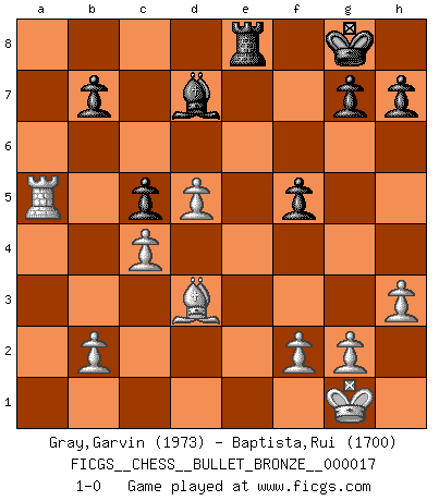 Last move : 1-0 2008 May 12 19:7:26 [Event "FICGS__CHESS__BULLET_BRONZE__000017"] [Site "FICGS"] [Date "2008.05.12"] [Round "1"] [White "Gray,Garvin"] [Black "Baptista,Rui"] [Result "1-0"] [WhiteElo "1973"] [BlackElo "1700"] 1.d4 c5 2.d5 Nf6 3.c4 e6 4.Nc3 d6 5.Nf3 Be7 6.e4 Nbd7 7.h3 Ne5 8.Nxe5 dxe5 9.Bd3 O-O 10.a4 exd5 11.exd5 e4 12.Nxe4 Nxe4 13.Bxe4 f5 14.Bd3 Bd7 15.O-O Qc7 16.Bd2 Bf6 17.Qc2 Rae8 18.Rfe1 Be5 19.Bc3 Bxc3 20.Qxc3 Rxe1+ 21.Rxe1 Bxa4 22.Ra1 Bd7 23.Rxa7 Re8 24.Qa5 Qxa5 25.Rxa5 1-0 Old Benoni defense Kingside Castling by player Black (move 9) Kingside Castling by player White (move 15) Player White won this chess game. Follow this game move after move (download)I know people who have all the will in the world, but still can't play good Chess. (Bobby Fischer) Meine Liebe ist Schach, Schach, Schach. Ich muss jeden Tag Schach spielen, deshalb fühle ich mich so stark. (Miguel Najdorf) No soy una persona materialista y por eso, no resiento la falta o pérdida del dinero. La ausencia de cosas mundanas carece de importancia. Ya que el Ajedrez es una forma en la que puedo ser tan materialista como yo desee sin tener la necesidad de vender mi alma. (Jamie Walter Adams) Votre prénom est 'Tactique', votre deuxième prénom est 'Tactique' et votre nom est 'Tactique'. (Ken Smith) I find your interest interesting. (Gregory House, House M.D.)