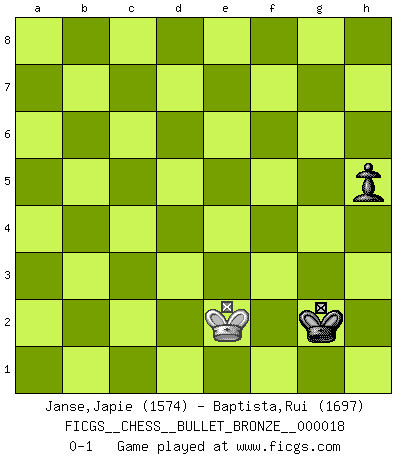 Last move : 0-1 2008 May 12 20:30:21 [Event "FICGS__CHESS__BULLET_BRONZE__000018"] [Site "FICGS"] [Date "2008.05.12"] [Round "1"] [White "Janse,Japie"] [Black "Baptista,Rui"] [Result "0-1"] [WhiteElo "1574"] [BlackElo "1697"] 1.e4 d5 2.exd5 Nf6 3.d4 e6 4.dxe6 Bxe6 5.Nf3 c5 6.Bb5+ Nc6 7.Bxc6+ bxc6 8.O-O Bd6 9.dxc5 Bxc5 10.Nc3 O-O 11.Bg5 Rb8 12.Qxd8 Rfxd8 13.Bxf6 gxf6 14.Ne4 Bd4 15.c3 Be5 16.b3 Bd5 17.Nxe5 Bxe4 18.f3 fxe5 19.fxe4 Rd3 20.Rf3 Rxf3 21.gxf3 Rd8 22.Kf2 Rd2+ 23.Kg3 Kg7 24.c4 f5 25.exf5 Kf6 26.c5 Kxf5 27.b4 Rb2 28.a3 Rb3 29.Kg2 Kf4 30.Ra2 Rxf3 31.Rf2 Rxf2+ 32.Kxf2 a6 33.a4 Kf5 34.Ke3 e4 35.b5 cxb5 36.axb5 axb5 37.c6 Ke6 38.c7 Kd7 39.c8Q+ Kxc8 40.Kxe4 Kc7 41.Kd4 Kd6 42.h4 h5 43.Kc3 Ke5 44.Kb4 Kf4 45.Kxb5 Kg4 46.Kc4 Kxh4 47.Kd3 Kg3 48.Ke2 Kg2 0-1 Scandinavian defense Kingside Castling by player White (move 8) Kingside Castling by player Black (move 10) 10 pieces endgame at move 32 : White KPPPP , Black KPPPP WHITE : King + 4 Pawns BLACK : King + 4 Pawns 9 pieces endgame at move 35 : White KPPP , Black KPPPP WHITE : King + 3 Pawns BLACK : King + 4 Pawns 8 pieces endgame at move 36 : White KPPP , Black KPPP WHITE : King + 3 Pawns BLACK : King + 3 Pawns 7 pieces endgame at move 36 : White KPP , Black KPPP WHITE : King + 2 Pawns BLACK : King + 3 Pawns Promotion Queen by player White (move 39) 6 pieces endgame at move 39 : White KP , Black KPPP WHITE : King + 1 Pawn BLACK : King + 3 Pawns 5 pieces endgame at move 40 : White KP , Black KPP WHITE : King + 1 Pawn BLACK : King + 2 Pawns 4 pieces endgame at move 45 : White KP , Black KP WHITE : King + 1 Pawn BLACK : King + 1 Pawn 3 pieces endgame at move 46 : White K , Black KP WHITE : King + BLACK : King + 1 Pawn Player Black won this chess game. Follow this game move after move (download)Chess opens and enriches your mind. (Saudin Robovic) Zeige mir drei Eröffnungsvarianten und ich beweise dir, dass zwei davon inkorrekt sind. (Emanuel Lasker) El Ajedrez es despiadado: debes de estar preparado para matar gente. (Nigel Short) Des combinaisons [dans le jeu d'échecs] pareilles à des mélodies. Je crois entendre pour ainsi dire la musique des coups... (Vladimir Nabokov) Luck never gives; it only lends. (Swedish proverb)