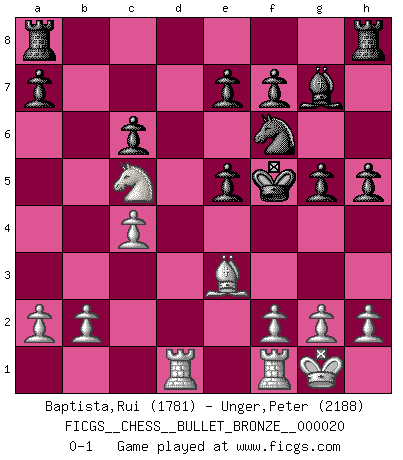 Last move : 0-1 2008 May 12 23:42:58 [Event "FICGS__CHESS__BULLET_BRONZE__000020"] [Site "FICGS"] [Date "2008.05.12"] [Round "1"] [White "Baptista,Rui"] [Black "Unger,Peter"] [Result "0-1"] [WhiteElo "1781"] [BlackElo "2188"] 1.e4 c5 2.Nf3 d6 3.Nc3 Nf6 4.Bb5+ Bd7 5.Bxd7+ Qxd7 6.O-O Nc6 7.d4 cxd4 8.Nxd4 g6 9.Nxc6 bxc6 10.Be3 Bg7 11.e5 dxe5 12.Qxd7+ Kxd7 13.Rad1+ Ke6 14.Na4 Kf5 15.c4 h5 16.Nc5 g5 0-1 This chess game has been lost on time (started : 2008.05.12 23:17:13) Sicilian Kingside Castling by player White (move 6) Player Black won this chess game. Follow this game move after move (download)Mistrust is the most necessary characteristic of the Chess player. (Siegbert Tarrasch) Irgendwie scheint mir sonntags früh um 9 Uhr der Killerinstinkt verloren gegangen zu sein. (Alexej Shirov) Prefiero perder una partida realmente buena, que ganar una mala. (David Levy) Vous n'êtes pas toujours obligé de jouer le meilleur coup. Un coup doit être actif, entreprenant, correct et beau ! (David Bronstein) For to win one hundred victories in one hundred battles is not the acme of skill. To subdue the enemy without fighting is the acme of skill. (Sun Tzu)