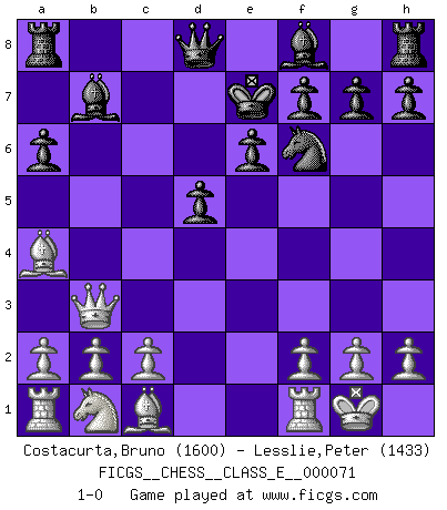 Last move : 1-0 2008 January 21 17:17:11 [Event "FICGS__CHESS__CLASS_E__000071"] [Site "FICGS"] [Date "2008.01.01"] [Round "1"] [White "Costacurta,Bruno"] [Black "Lesslie,Peter"] [Result "1-0"] [WhiteElo "1600"] [BlackElo "1433"] 1.e4 c5 2.Nf3 e6 3.d4 cxd4 4.Nxd4 a6 5.Bc4 Nf6 6.Qf3 Nc6 7.Nxc6 bxc6 8.O-O d5 9.exd5 cxd5 10.Bb3 Bb7 11.Ba4+ Ke7 12.Qb3 1-0 Sicilian : Kan variation Kingside Castling by player White (move 8) Player White won this chess game. Follow this game move after move (download)The most powerful weapon in Chess is to have the next move. (David Bronstein) Warum muß ich gegen diesen IDIOTEN verlieren? (Aaron Nimzowitsch) Yo no creo en la psicología. Yo creo en las buenas movidas. (Bobby Fischer) Echiquier : carré parfait, comme la Jérusalem nouvelle décrite par l'auteur de l'Apocalypse, huit cases sur huit, exaltation du chiffre 4, symbole du cosmos aux quatre horizons... où le noir et le blanc, l'ombre et la lumière, le mal et le bien s'entremêlent et se conjuguent. (Robert Couffignal, Le Gambit du poète) Success without honor is an unseasoned dish; it will satisfy your hunger, but it won't taste good. (Joe Paterno)